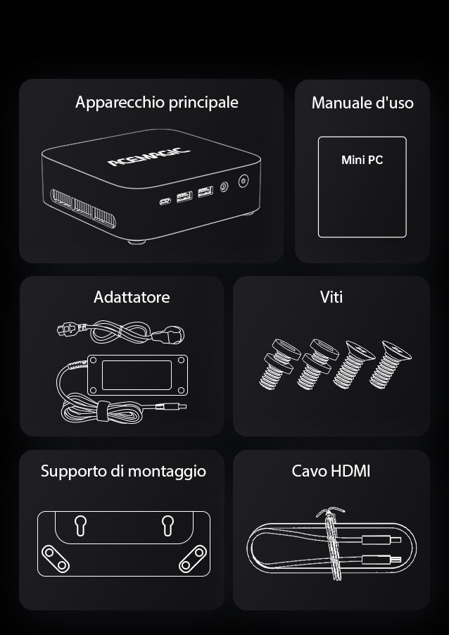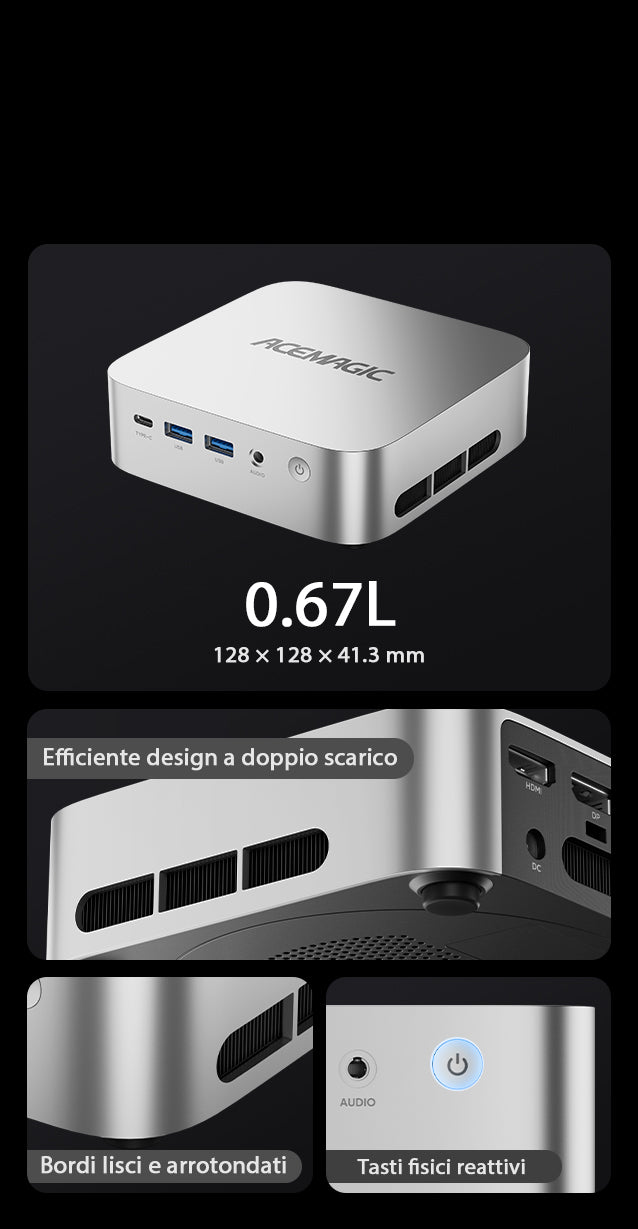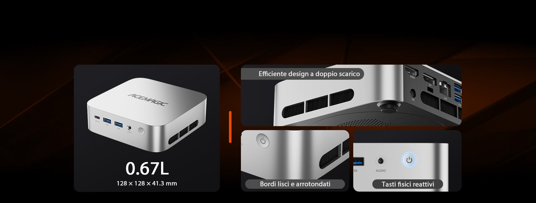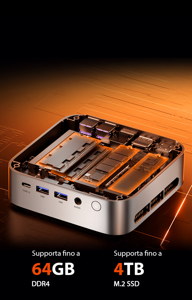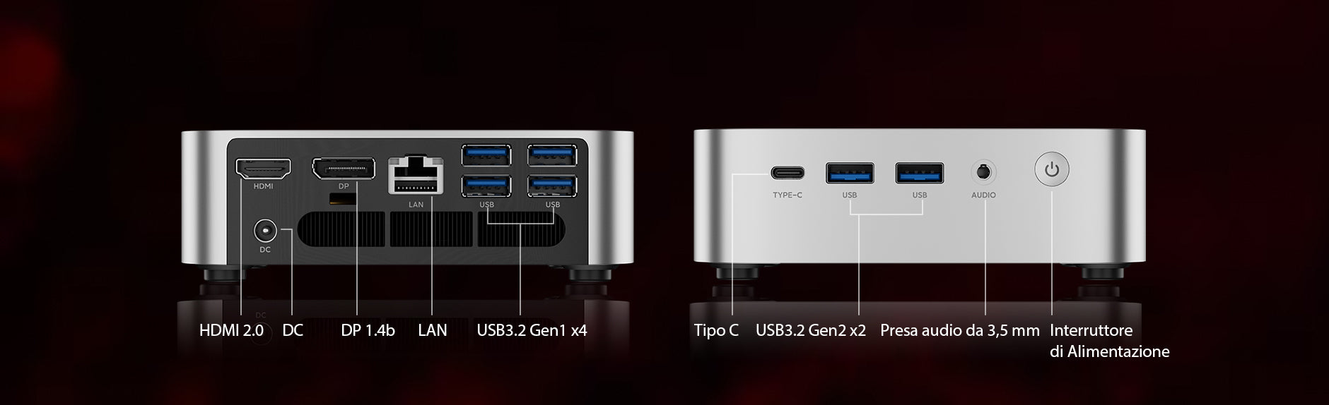 | Porte e pulsanti | Porta Gigabit Ethernet RJ45 Adattabile 10M/100M/1000M ×1 Porta USB3.2 Gen2 Type- A ×2 (10 Gbps) Porta USB3.2 Gen1 Type-A ×4 (5 Gbps) USB 3.2 Gen 2 Type-C ×1 Ingresso DC ×1 HDMI 2.0 ×1 DP 1.4b ×1 Connettore Audio da 3,5 mm ×1 Pulsante di Accensione ×1 |