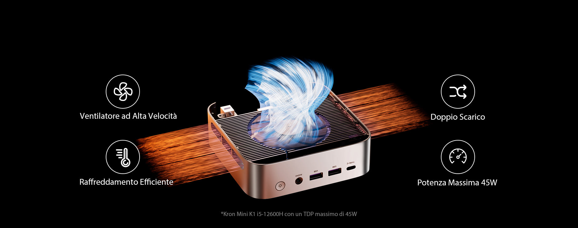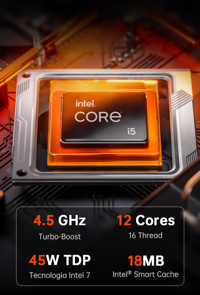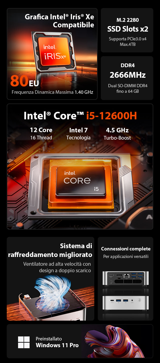 Dotato di processore Intel® Core™ i5-12600H, 12 core e 16 thread per un multitasking ad alta velocità. Dotato di 16 GB DDR4 e 512 GB SSD, supporta l'uscita video 4K su 3 schermi.