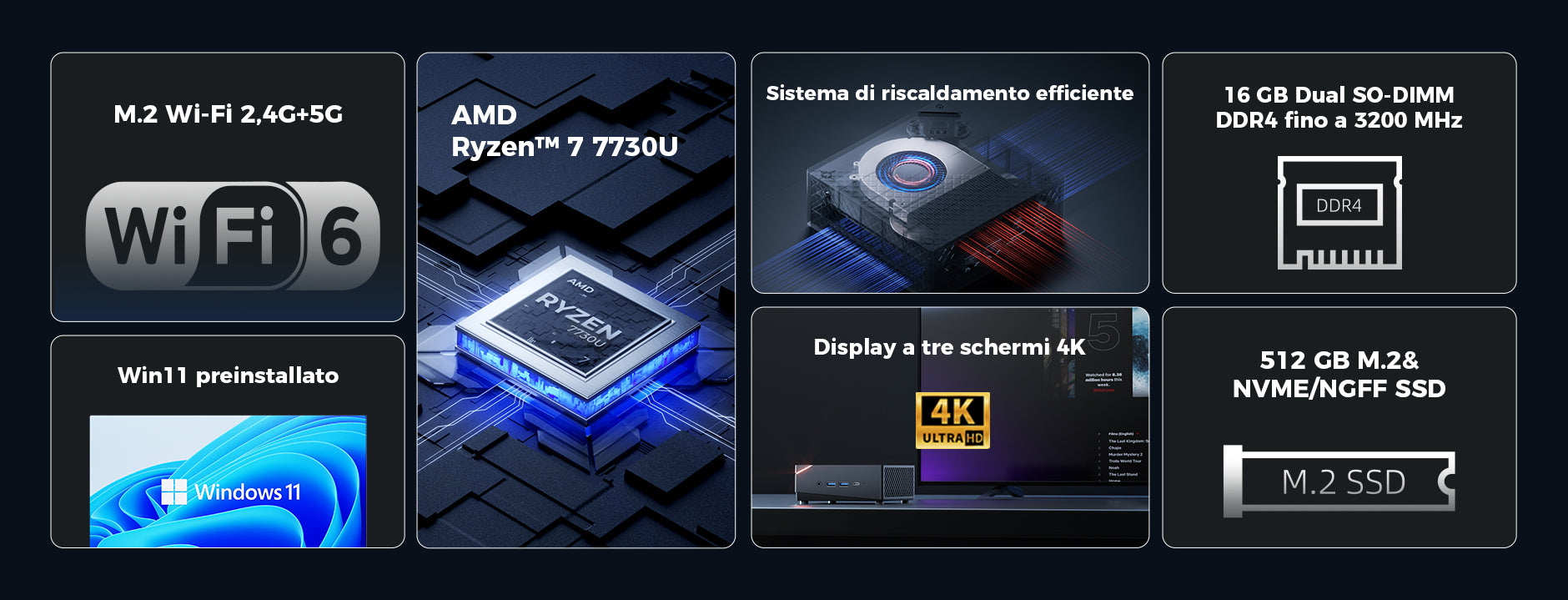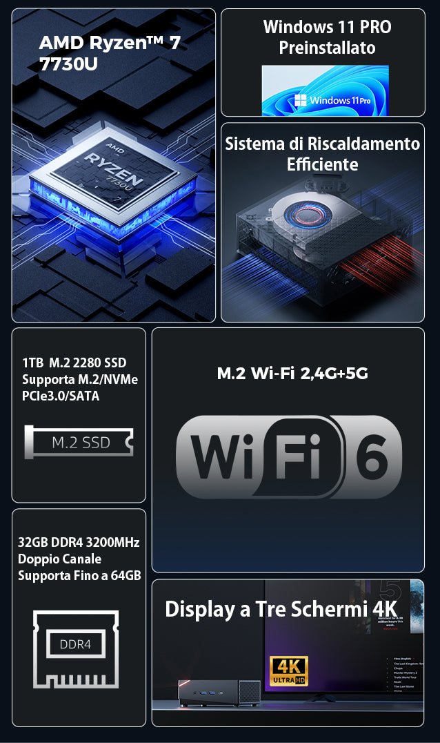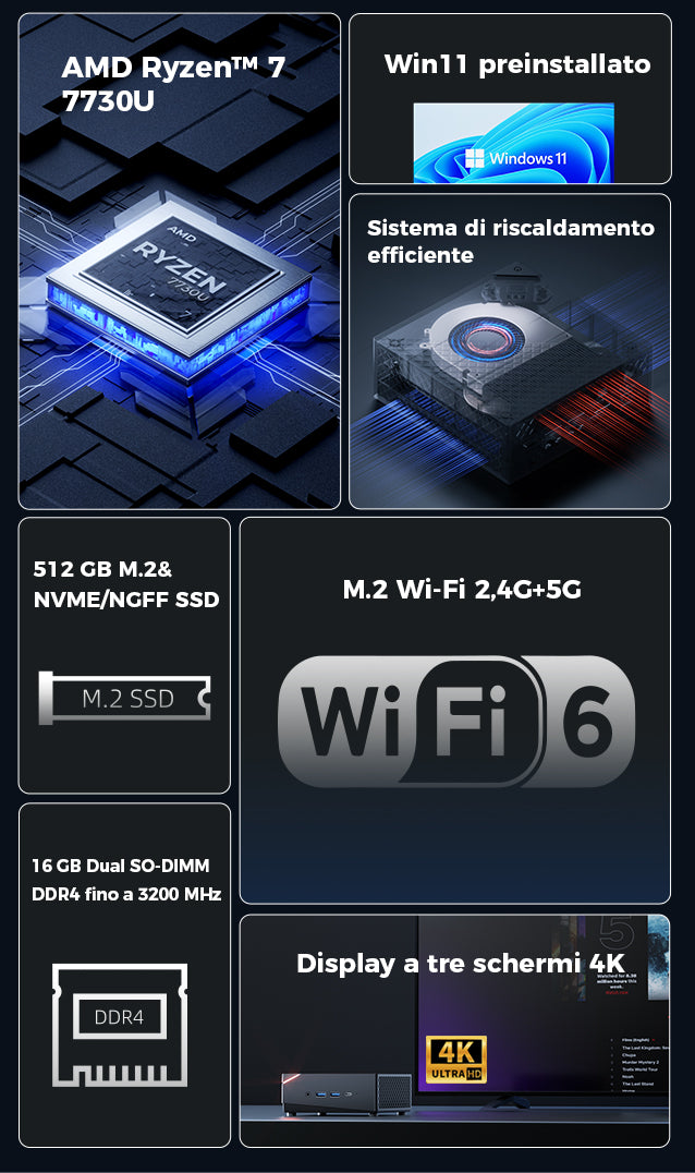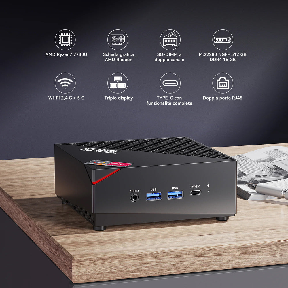 ACEMAGIC AM06 Pro è un potente minicomputer dotato di processore AMD Ryzen 7 7730U. È ideale per i giochi e dispone di 16/32GB di memoria DDR4 e un SSD da 512GB / 1TB(espandibile fino a un massimo di 2 TB). Sostiene la tripla uscita display 4K@60Hz tramite interfacce HDMI 2.0, USB-C e DP 1.4. Inoltre, dispone di due porte Ethernet e WiFi 6 e funziona con il sistema operativo Windows 11 Pro.