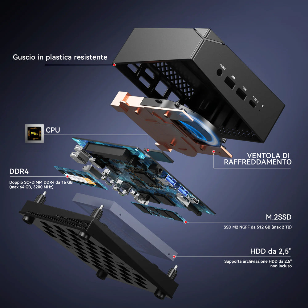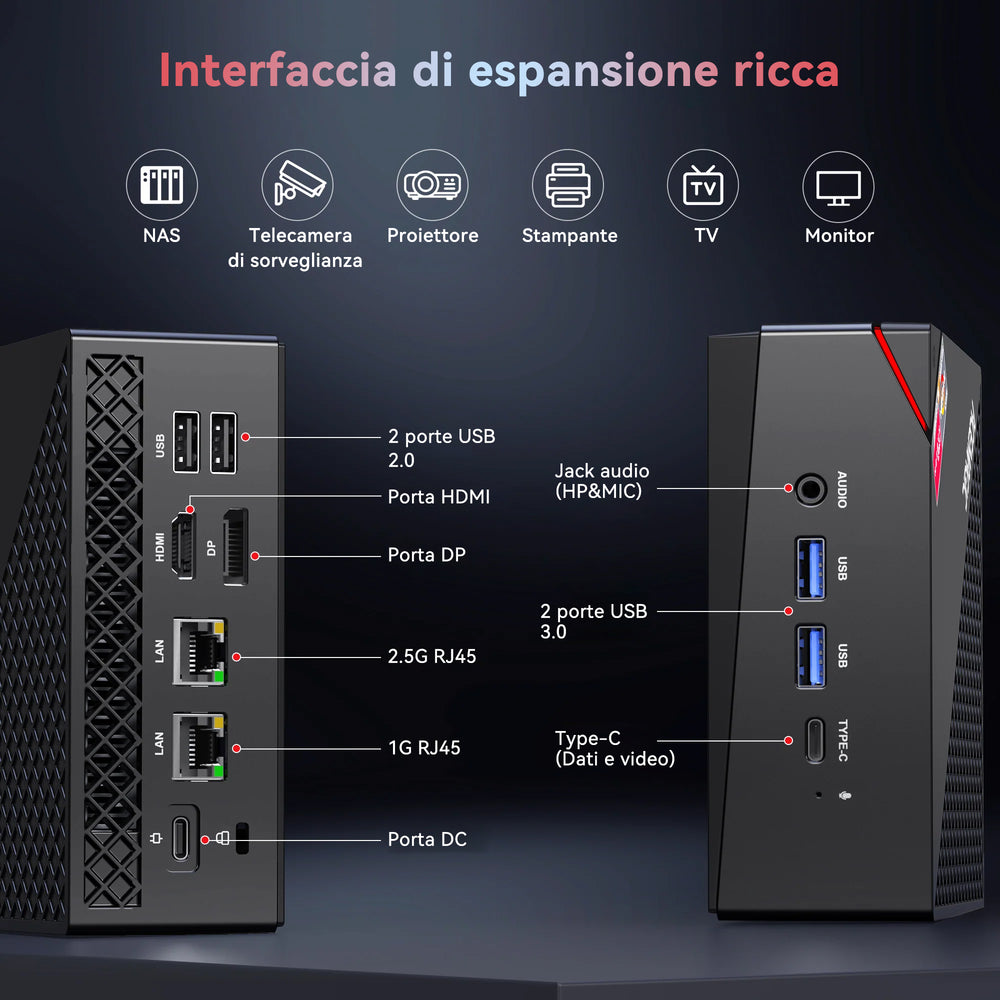 Il mini PC am06 vanta un design compatto ed elegante, che lo rende la scelta ideale per chi è alla ricerca di una soluzione salvaspazio. La struttura robusta garantisce durata nel tempo e il design accurato consente una facile integrazione in vari ambienti domestici o lavorativi. L'ingombro ridotto del mini desktop è un vantaggio decisivo per chi ha poco spazio sulla scrivania.