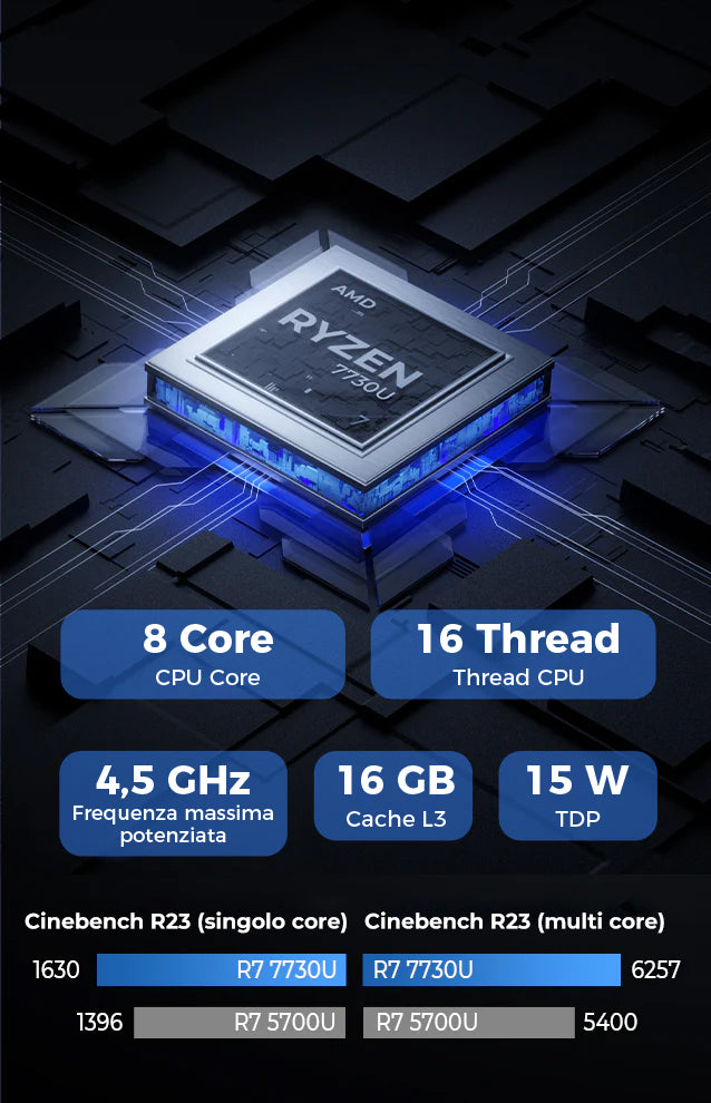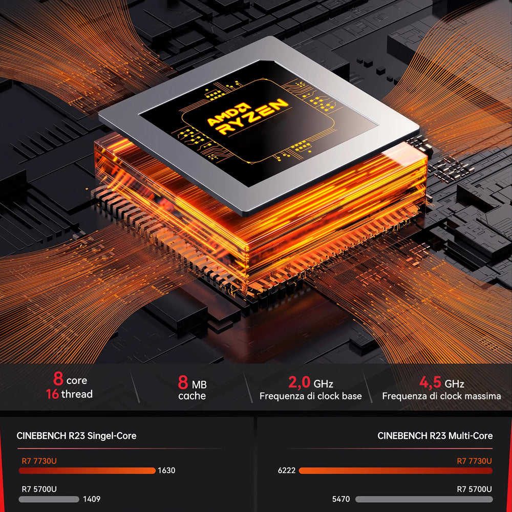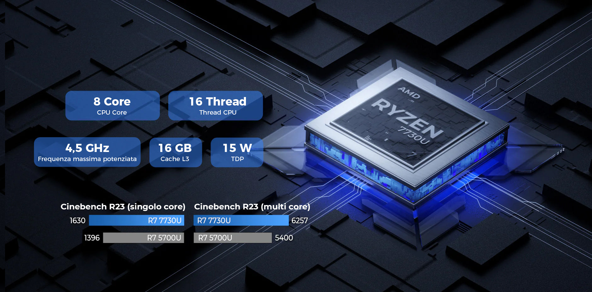 | Processore | AMD Ryzen™ 7 7730U Prozessor, 8 Core/16 Thread (Architettura Zen3, Processo di Elaborazione FinFET TSMC a 7 nm, 16 MB L3-Cache, Frequenza Base 2,0 GHz, Frequenza Turbo Fino a 4,5 GHz) |