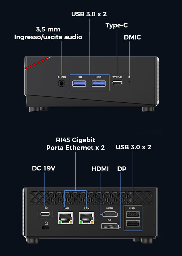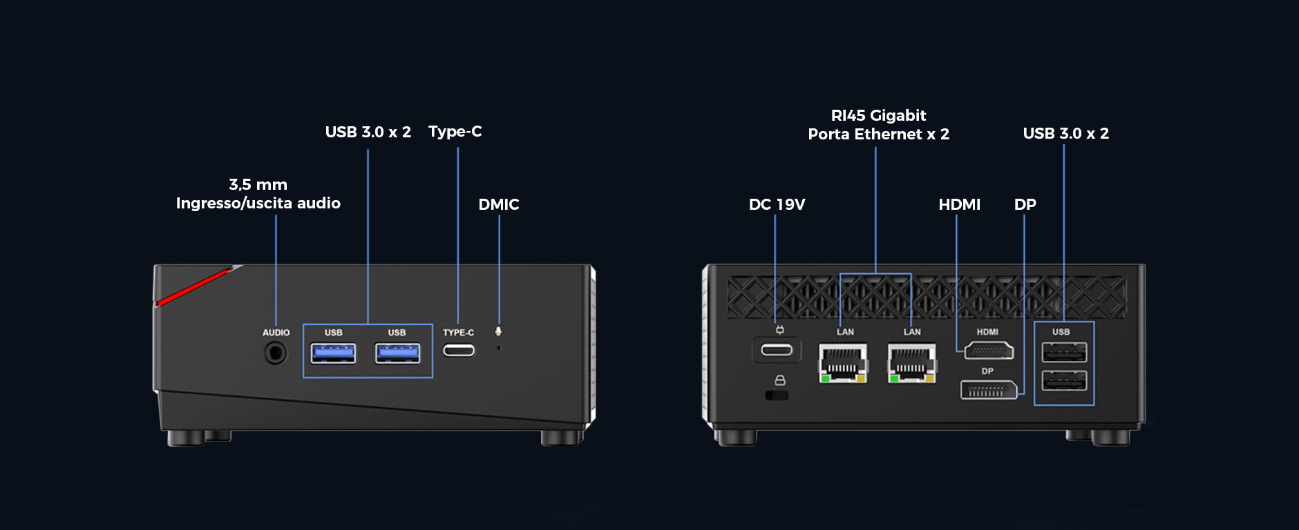 | Porte e Pulsanti | Gigabit Ethernet RJ45 Adattivo 10 M/100 M/1000 M/2,5 Gbps*1 Gigabit Ethernet RJ45 1,0 Gbps*1 USB 3.2 Gen 2 Typ-A*2 USB 2.0 Typ-A*2 USB 3.2 Gen 2 Typ-C*1 (Supporta DP 1.4, 4K @ 60 Hz) Jack di Ingresso Type-C*1 HDMI 2.0*1 (4K@60Hz) DP 1.4*1 (4K@60Hz) Jack Audio da 3,5 mm*1 Pulsante di accensione*1 |