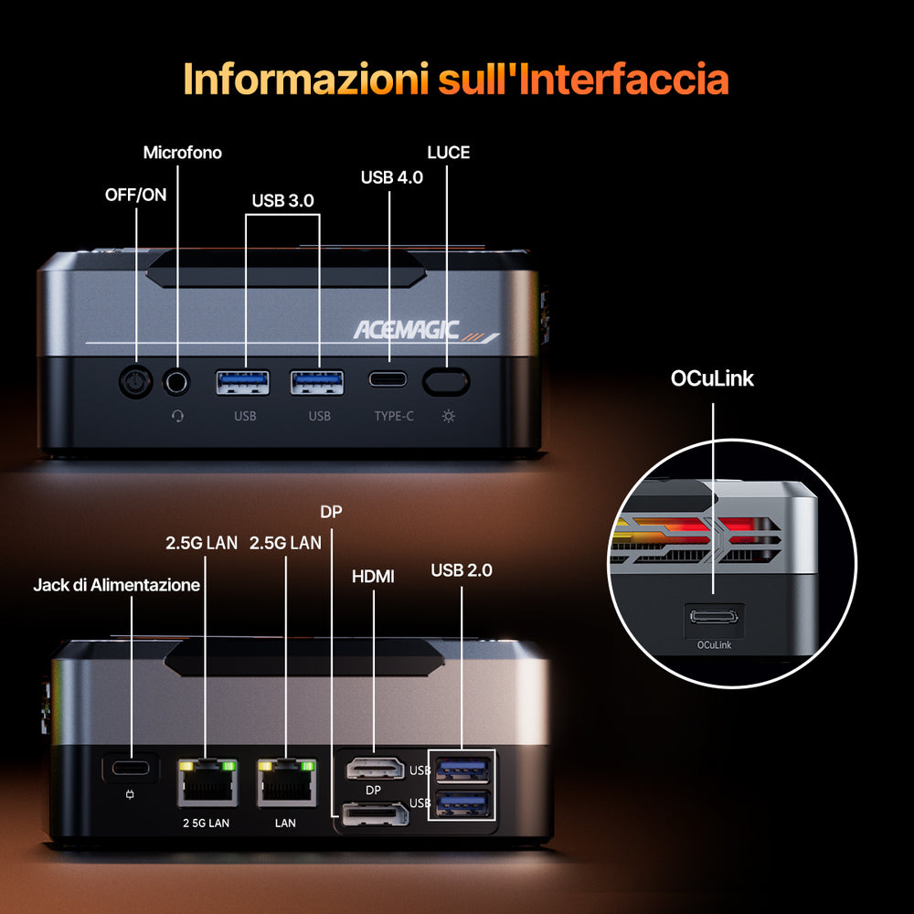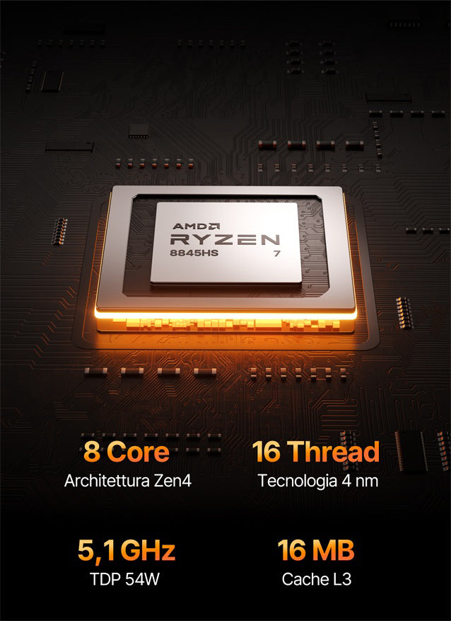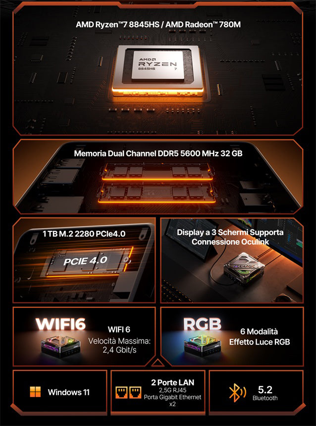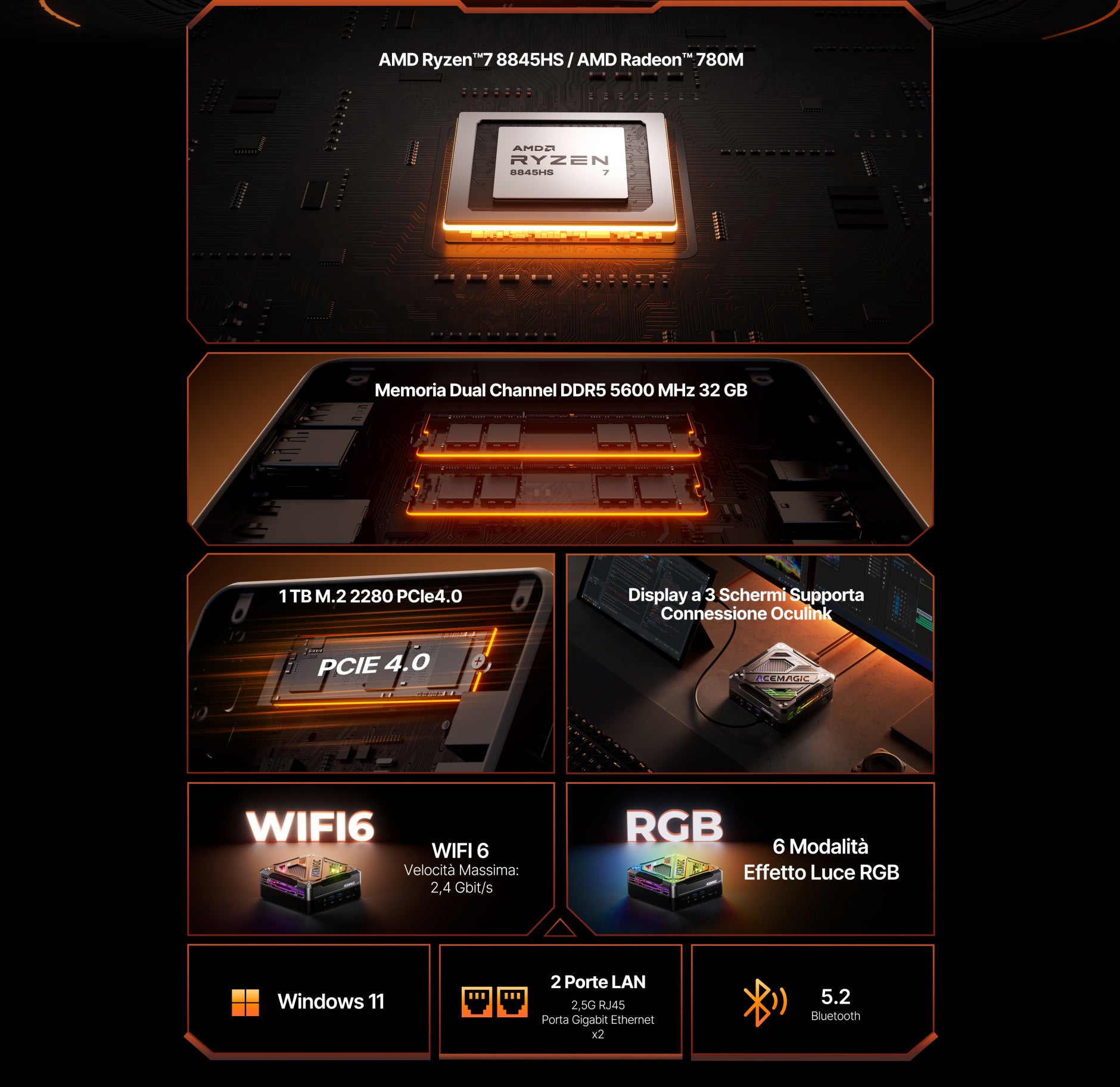Alimentato da un processore AMD Ryzen™ 7 8845HS. Include un motore AI AMD Ryzen™ con prestazioni fino a 16 TOPS e prestazioni AI combinate fino a 38 TOPS. Il mini PC dispone di 32 GB di memoria dual channel DDR5 a 5600 MHz (espandibile fino a 64 GB). Le funzionalità di connettività includono WiFi 6, Bluetooth 5.2, HDMI 2.1, USB4.0 Type-C e DP2.0, tutti con supporto 4K@144Hz o 8K@60Hz. Dispone inoltre di due porte Gigabit Ethernet RJ45 da 2,5G, diverse porte USB, un jack telefonico da 3,5 mm e un interruttore di alimentazione.