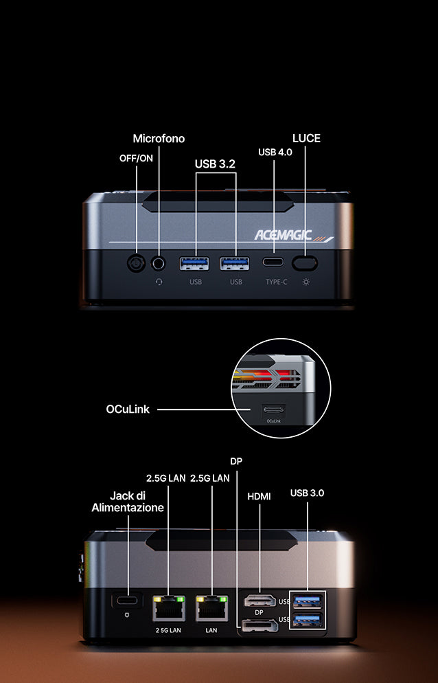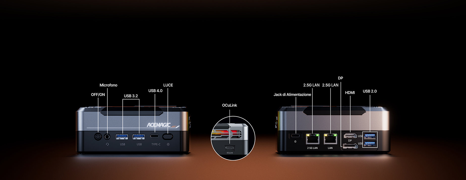 | Connessioni e Tasti | Porta Gigabit Ethernet RJ45 2.5G ×2 Porta USB3.2 Gen2 Type-A ×2(Velocità di Trasferimento Dati Massima 10Gbps) Porta USB2.0 Type-A ×2 USB4 Type-C ×1(Uscita Audio/Video 8K@60Hz, Velocità di Trasferimento Dati Massima 40Gbps, Uscita PD) Type-C IN ×1(Ingresso 100W) HDMI 2.1 ×1 (Supporta 4K@144Hz o 8K@60Hz) DP2.0×1 (Supporta 4K@144Hz o 8K@60Hz) Jack Audio da 3,5 mm x1 (Interfaccia 2 in 1) Pulsante di Accensione ×1 Pulsante di Controllo Luci RGB×1 Porta OcuLink×1 (Possibilità di Collegare una Scheda Grafica Dedicata) |