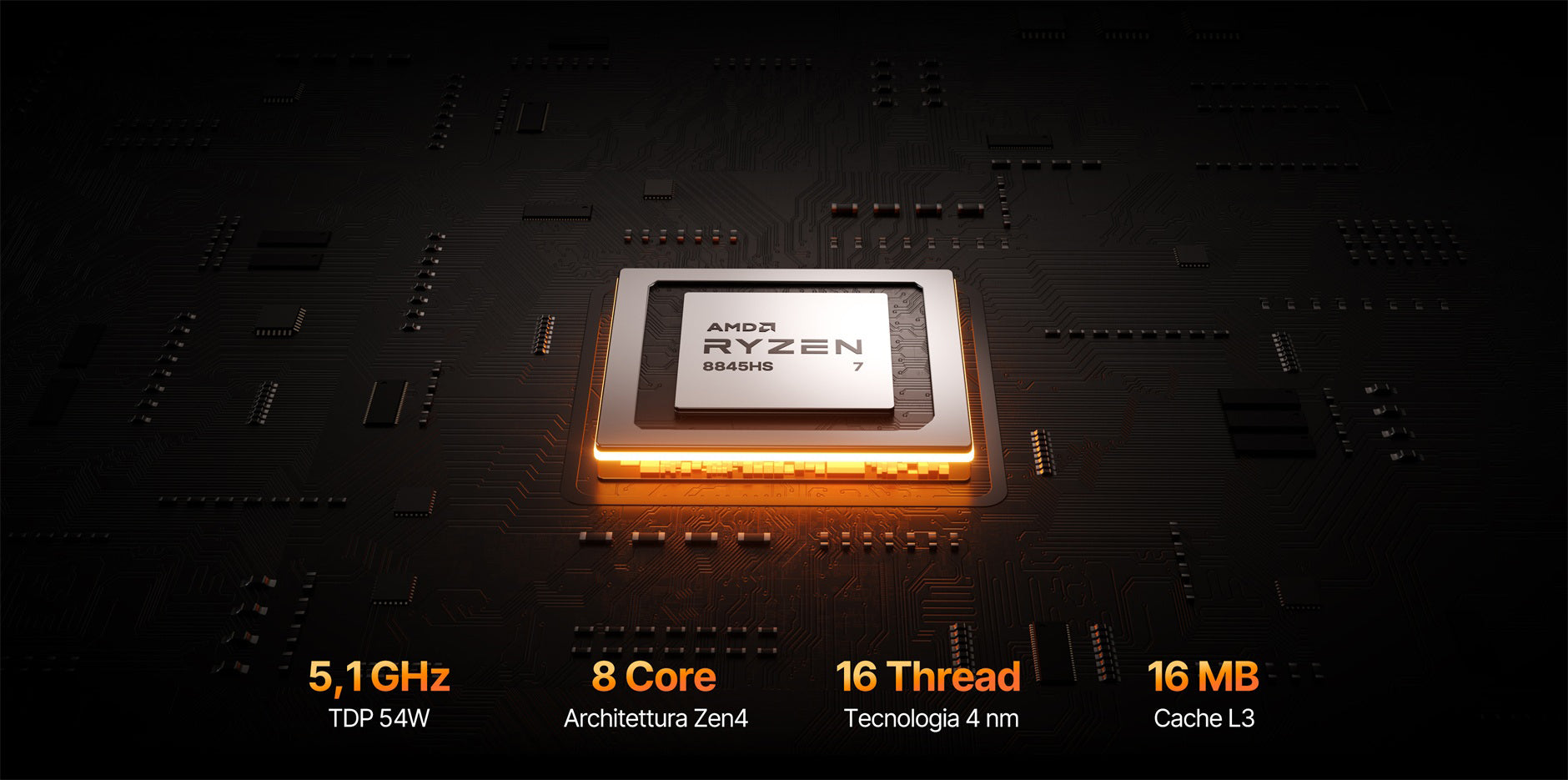 Processore AMD Ryzen™ 7 8845HS, 8 Core/16 Thread, Architecture Zen 4, L3 Cache da 16 MB, Frequenza Massima Boost Fino a 5,1 GHz, |