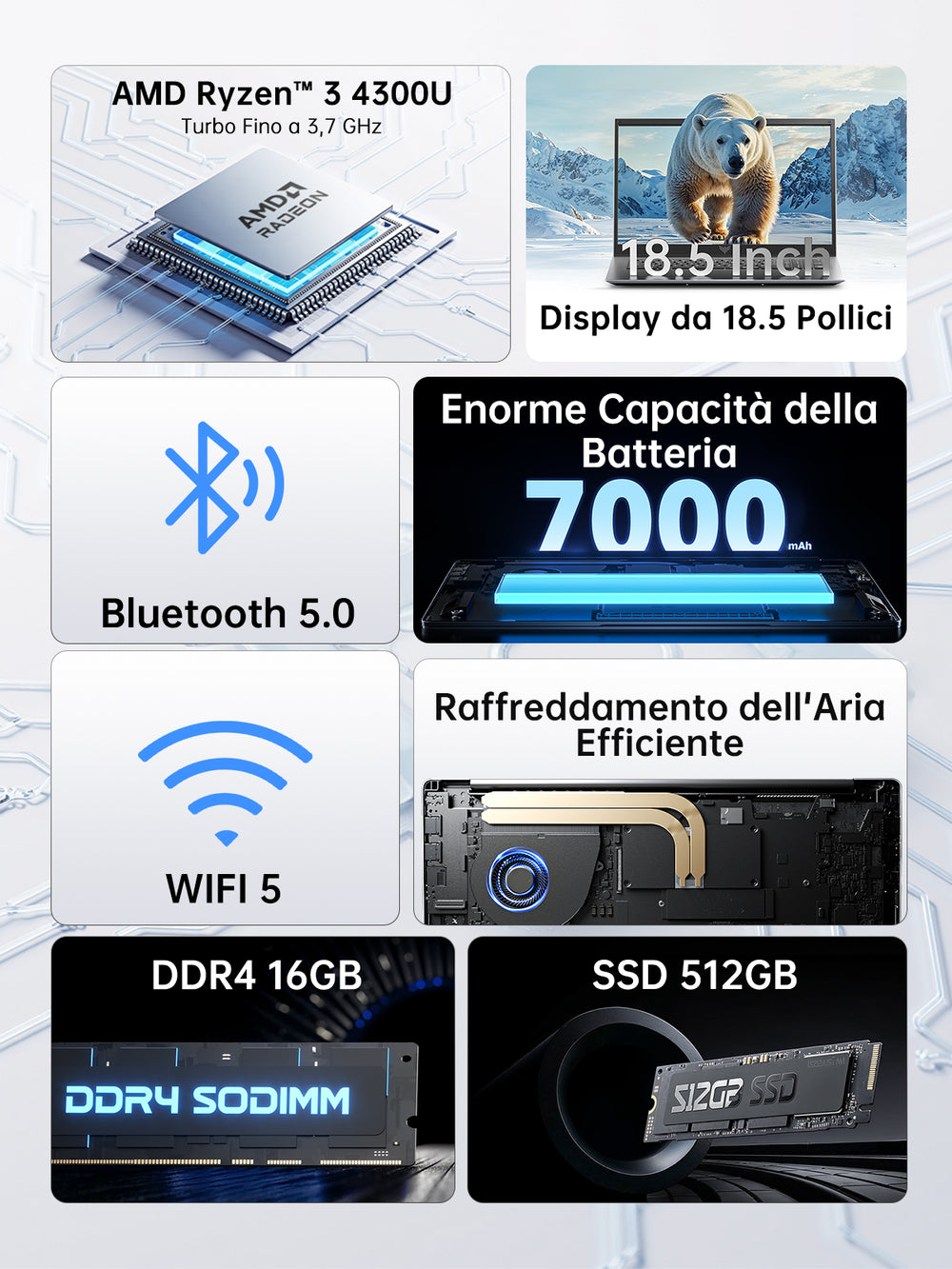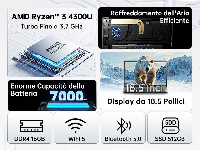 | Processore | Processore AMD Ryzen™ 3 4300U, 4 Core/4 Thread, Architettura Zen 2, Processo Produttivo del Processore TSMC a 7nm FinFET, Frequenza di Clock di Base: 2,7GHz, Frequenza Turbo: 3,7GHz |
