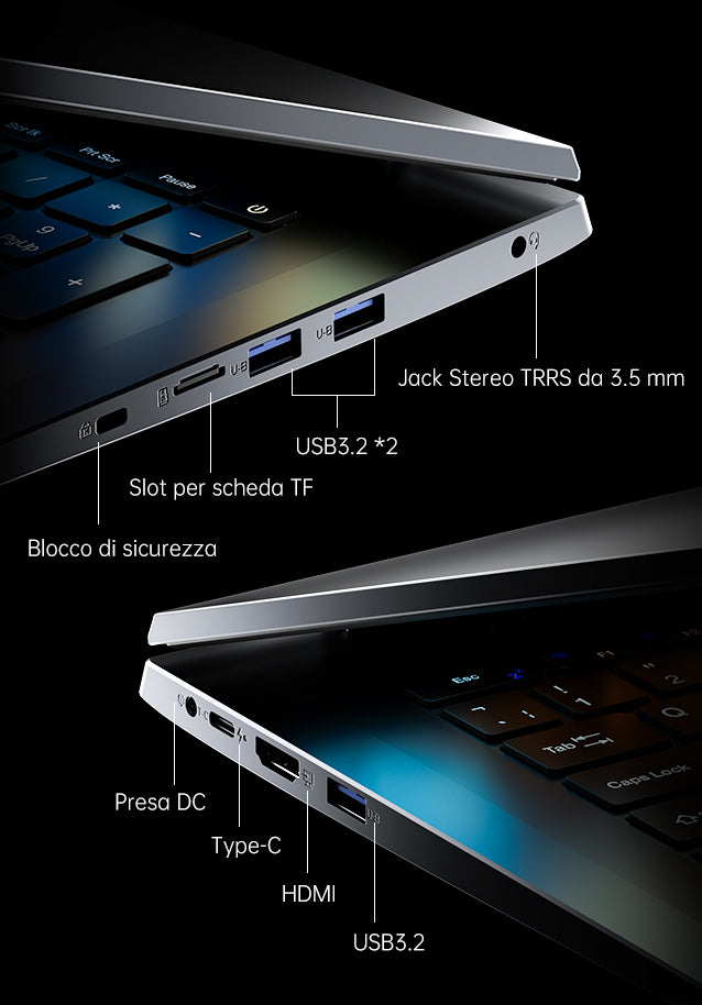 | Connessioni e Tasti | USB 3.2 x2 USB 2.0 x1 Jack per Cuffie da 3,5 mm x1 HDMI 1.4 *1 Type-C (Funzionalità Complete, Ingresso Type-C) * 1 Type-C (Dati) * 1 Foro della Serratura * 1 TF *1 |