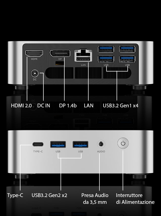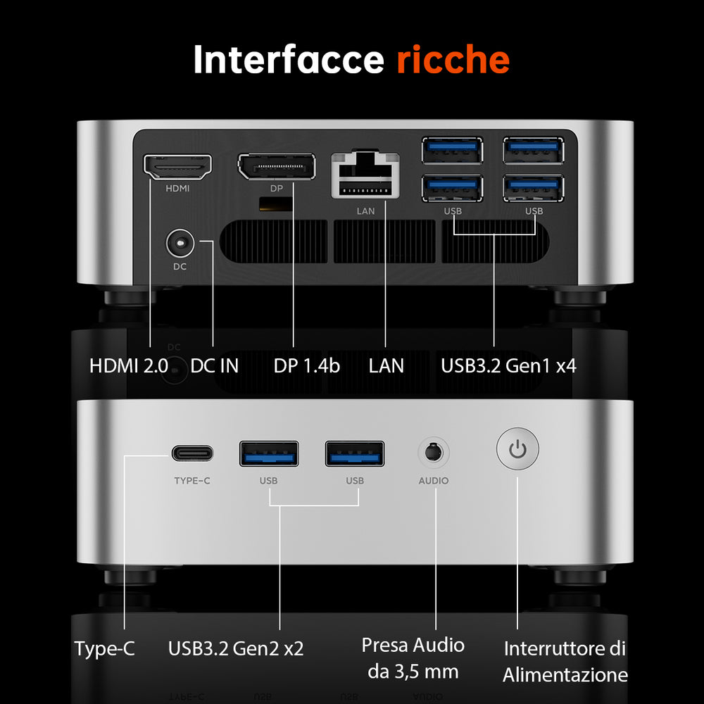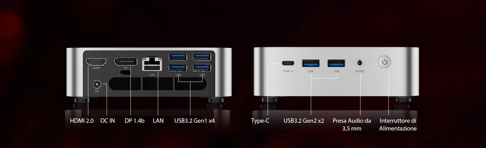 | Porte e pulsanti | Porta Gigabit Ethernet RJ45 Adattabile 10M/100M/1000M ×1 Porta USB3.2 Gen1 Type- A ×6 (10 Gbps) USB3.2 Gen1 Type-C (Dati + Uscita Video DisplayPort 1.4) ×1 Ingresso DC ×1 HDMI 2.0 ×1 DP 1.4b ×1 Connettore Audio da 3,5 mm ×1 Pulsante di Accensione ×1 |