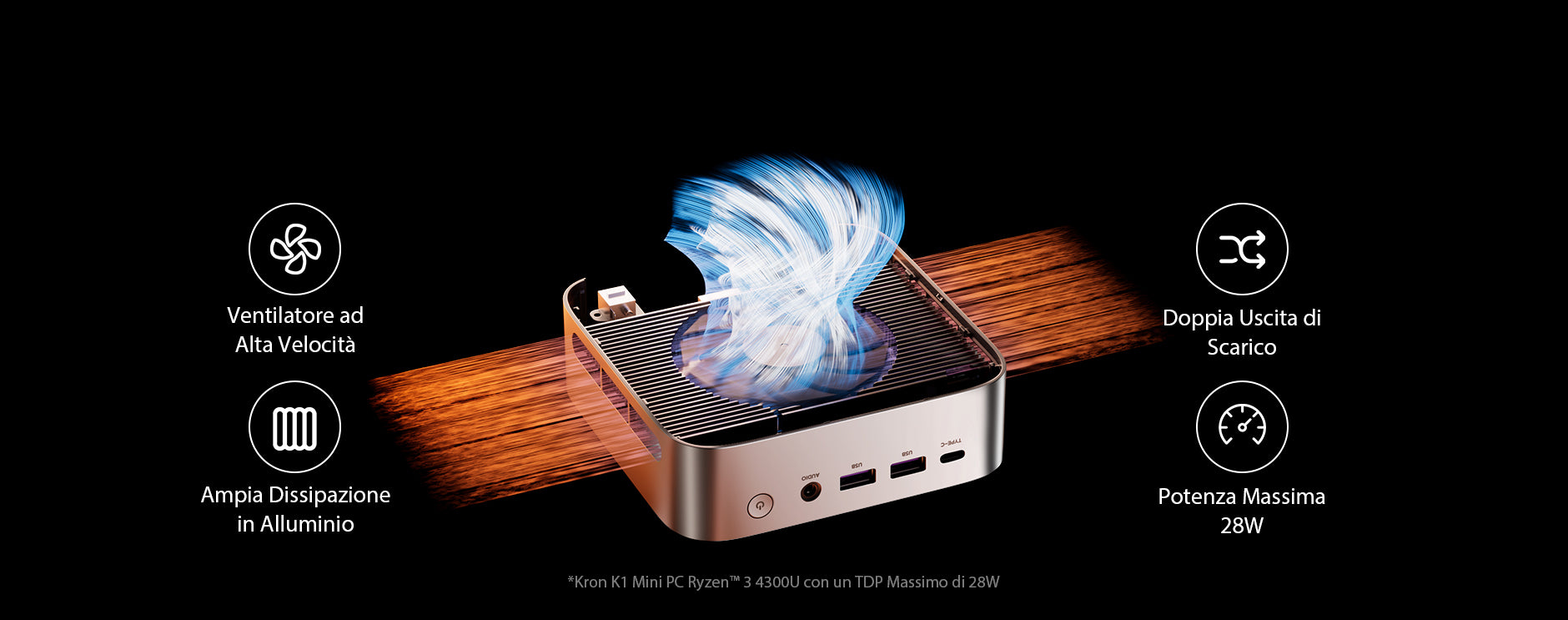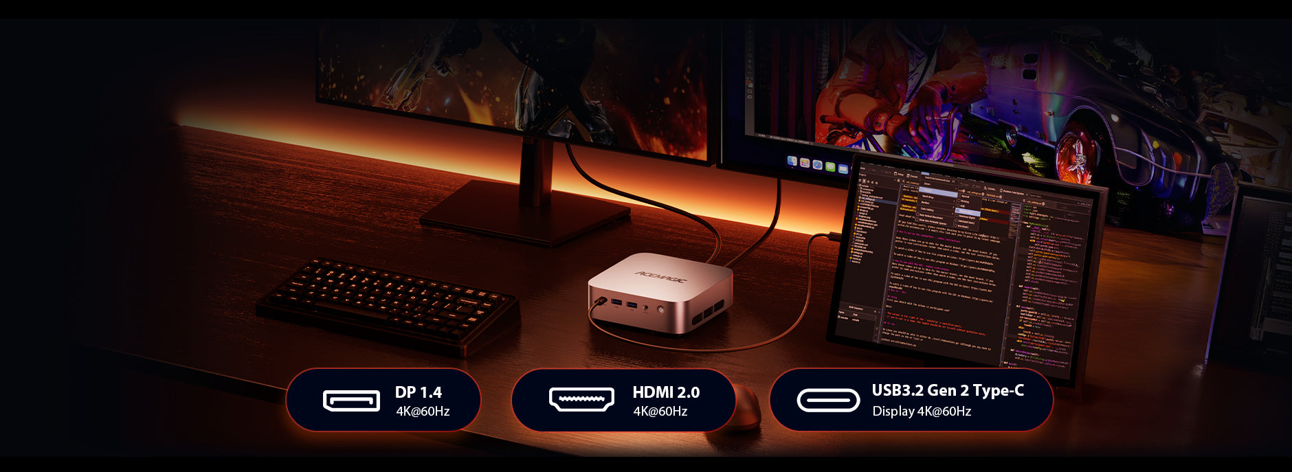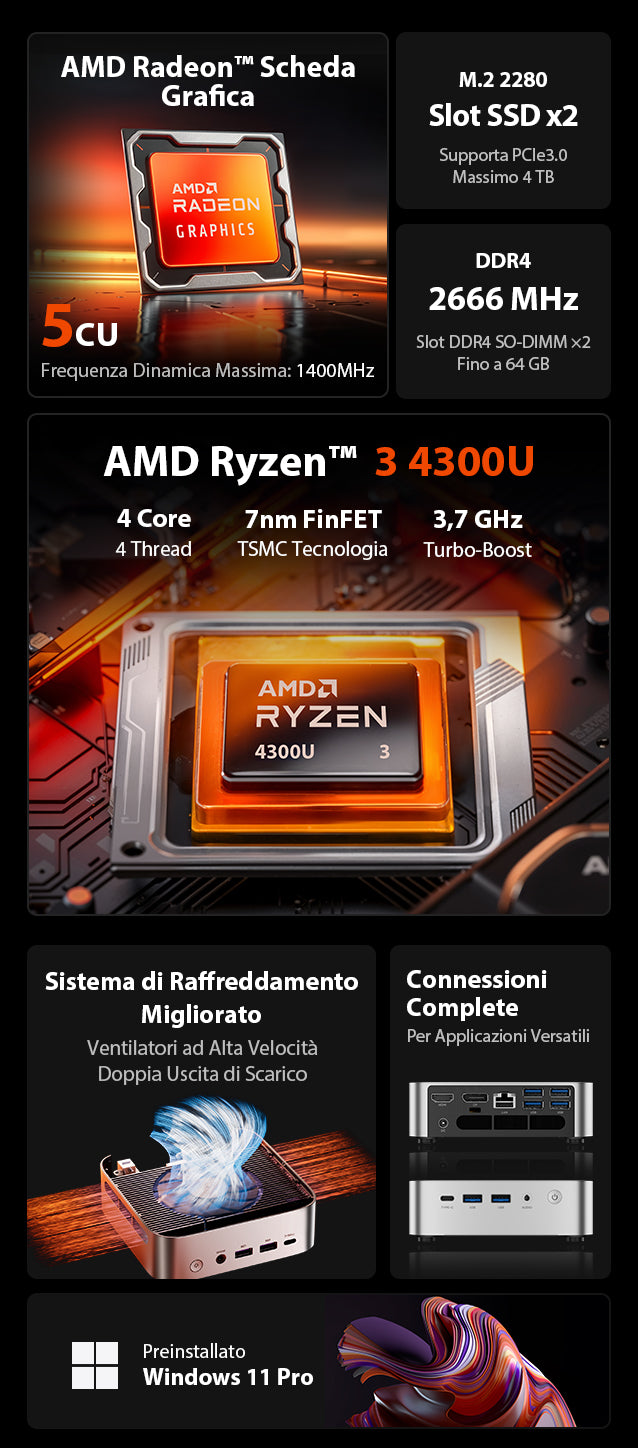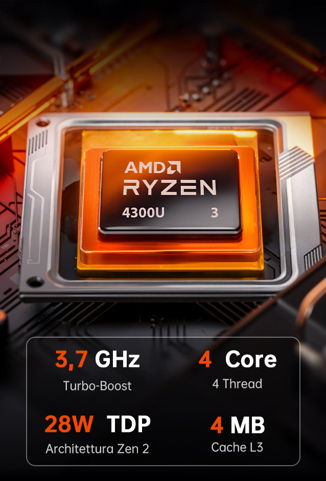 Dotato di processore Ryzen 3 3300U/4300U, 4 core e 4 thread per un multitasking ad alta velocità. Dotato di 16 GB DDR4 e 512 GB/1 TB SSD, supporta l'uscita video 4K su 3 schermi.