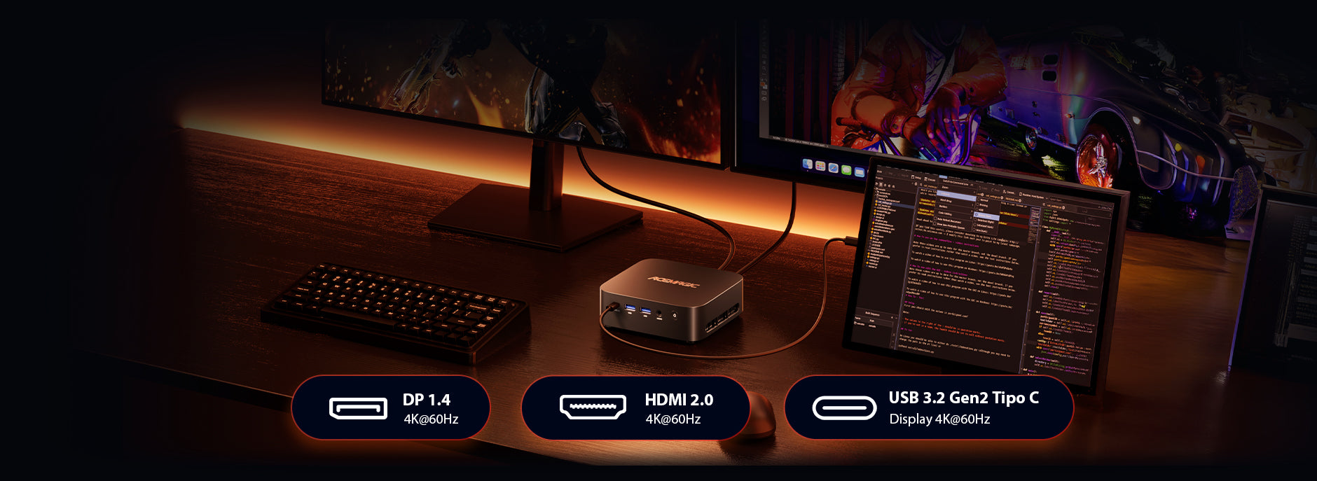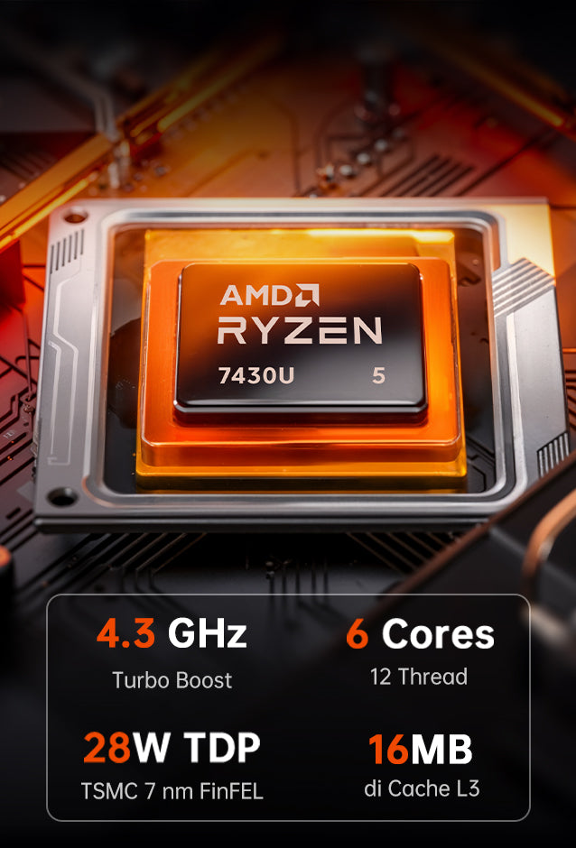 Dotato di processore Ryzen 5 7430U/Ryzen 3 3300U, 6 core e 12 thread / 4 core e 4 thread per un multitasking ad alta velocità. Dotato di 16 GB DDR4 e 512 GB SSD, supporta l'uscita video 4K su 3 schermi.