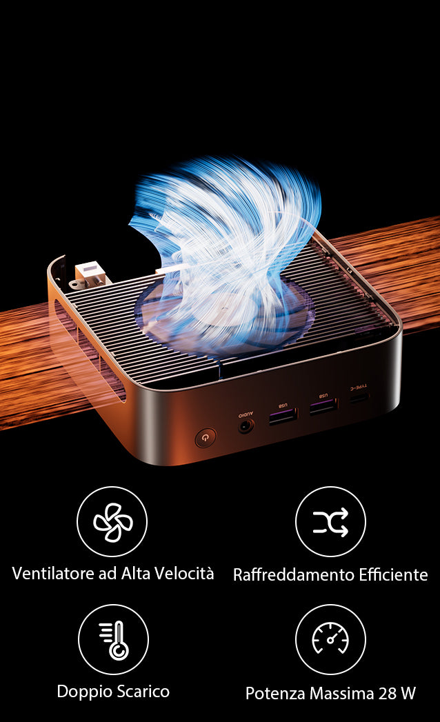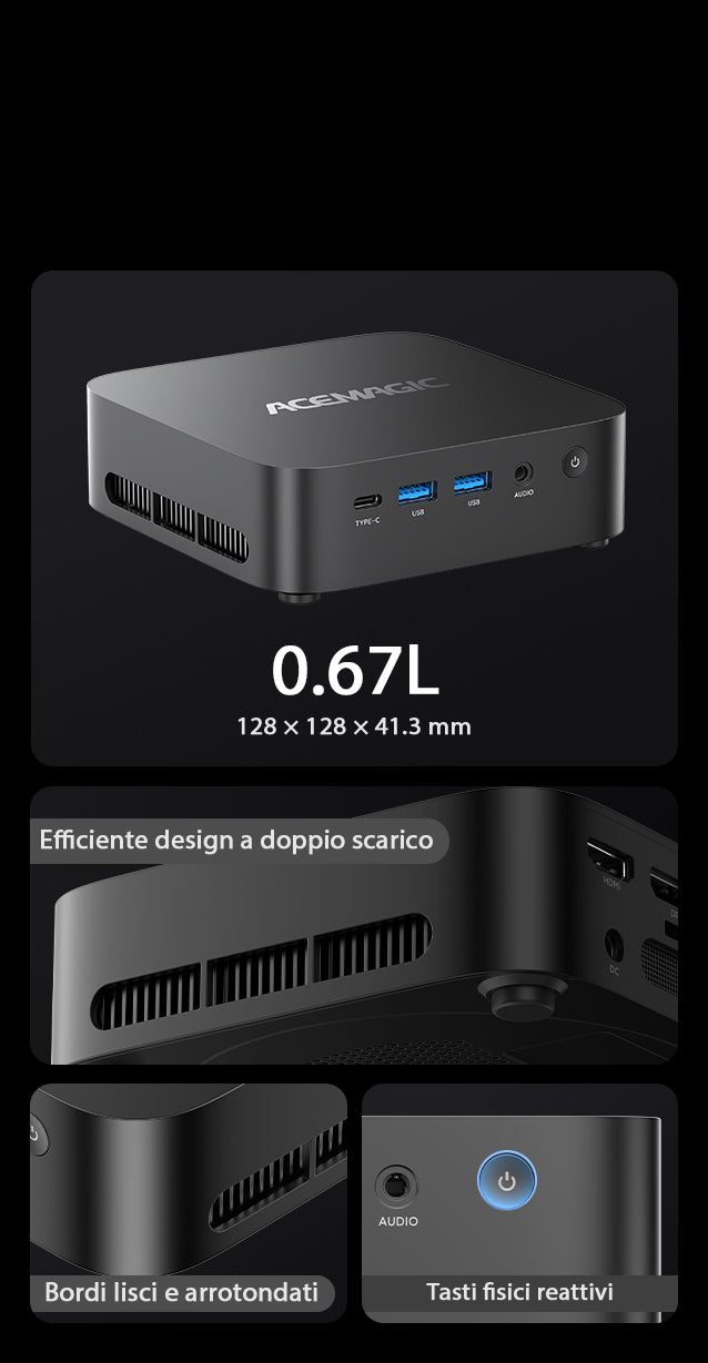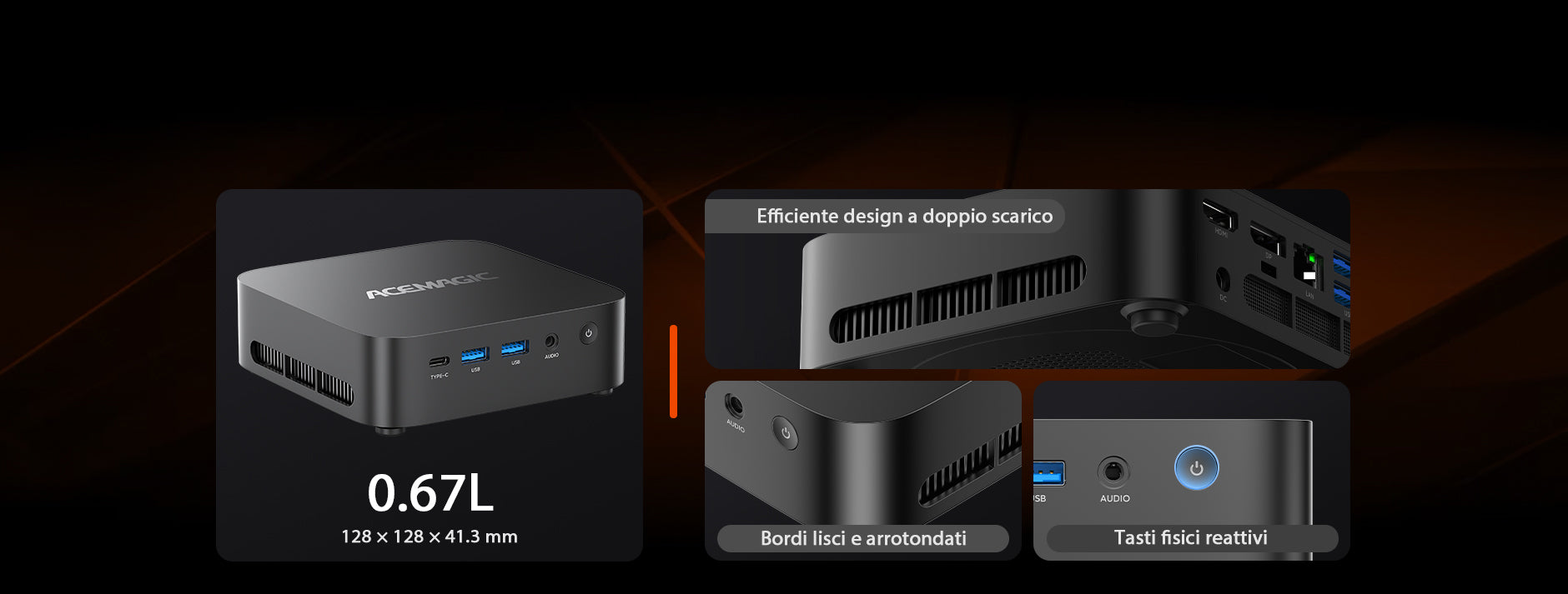 | Porte e pulsanti | Porta Gigabit Ethernet RJ45 Adattabile 10M/100M/1000M ×1 Porta USB3.2 Gen2 Type- A ×2 (10 Gbps) Porta USB3.2 Gen1 Type-A ×4 (5 Gbps) USB 3.2 Gen 2 Type-C ×1 Ingresso DC ×1 HDMI 2.0 ×1 DP 1.4b ×1 Connettore Audio da 3,5 mm ×1 Pulsante di Accensione ×1 |