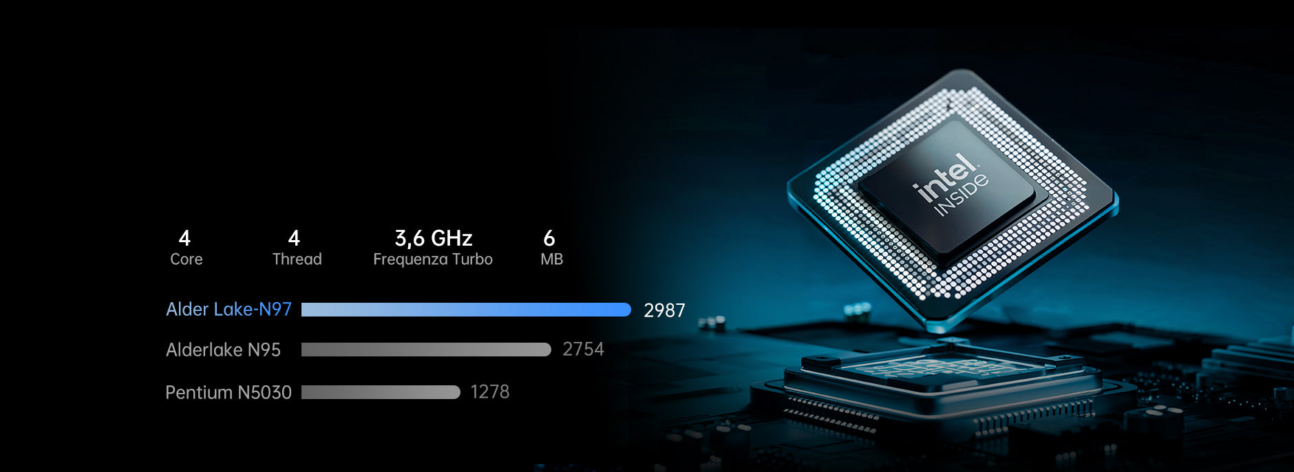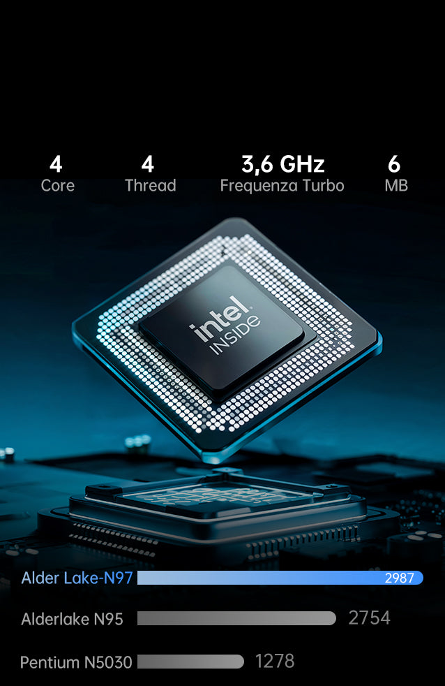 | Processore | Processore Intel® Twin Lake N97, 4 Core/4 Thread, Tecnologia di Processo Intel 7, 6 MB Intel® Smart Cache, Frequenza di Clock di Base: 2,0 GHz, Frequenza Turbo: 3,6 GHz |