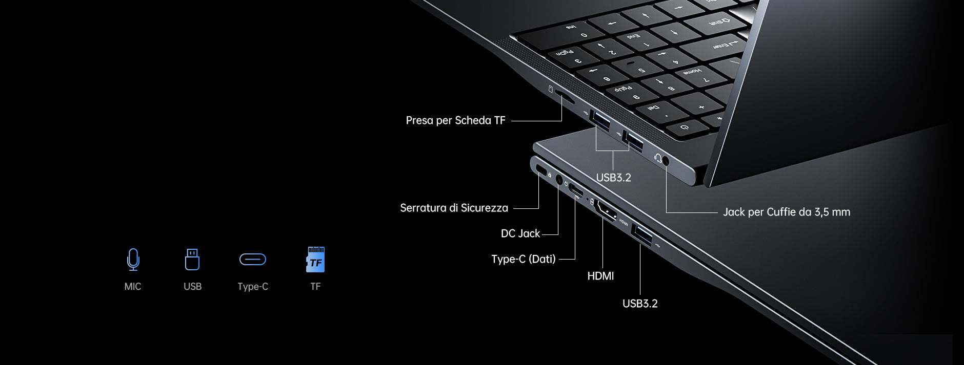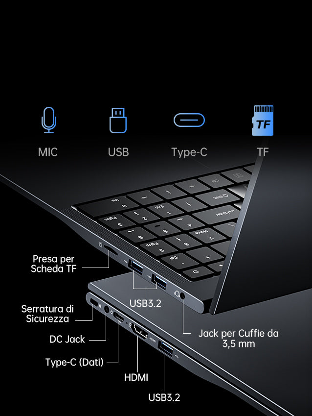 USB 3.2 *3 Connettore per Cuffie da 3,5 mm *1 DC IN *1 HDMI 1.4 *1 Type-C (Dati) *1 TF *1 Forello*1 |