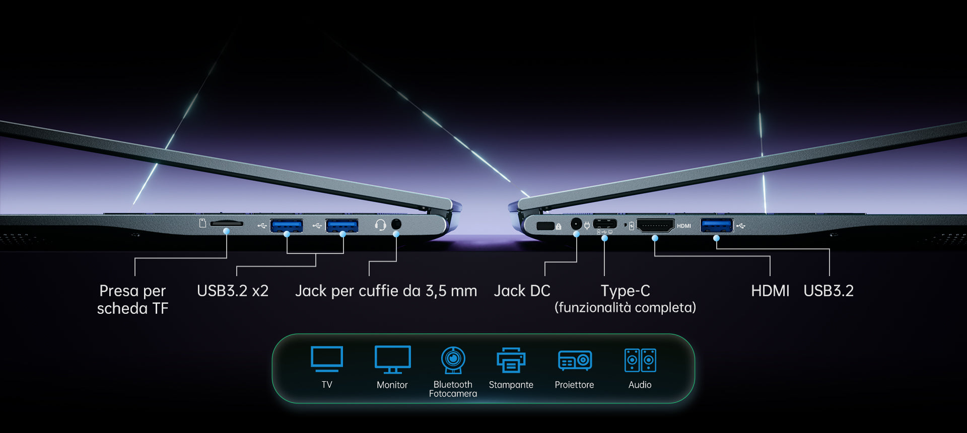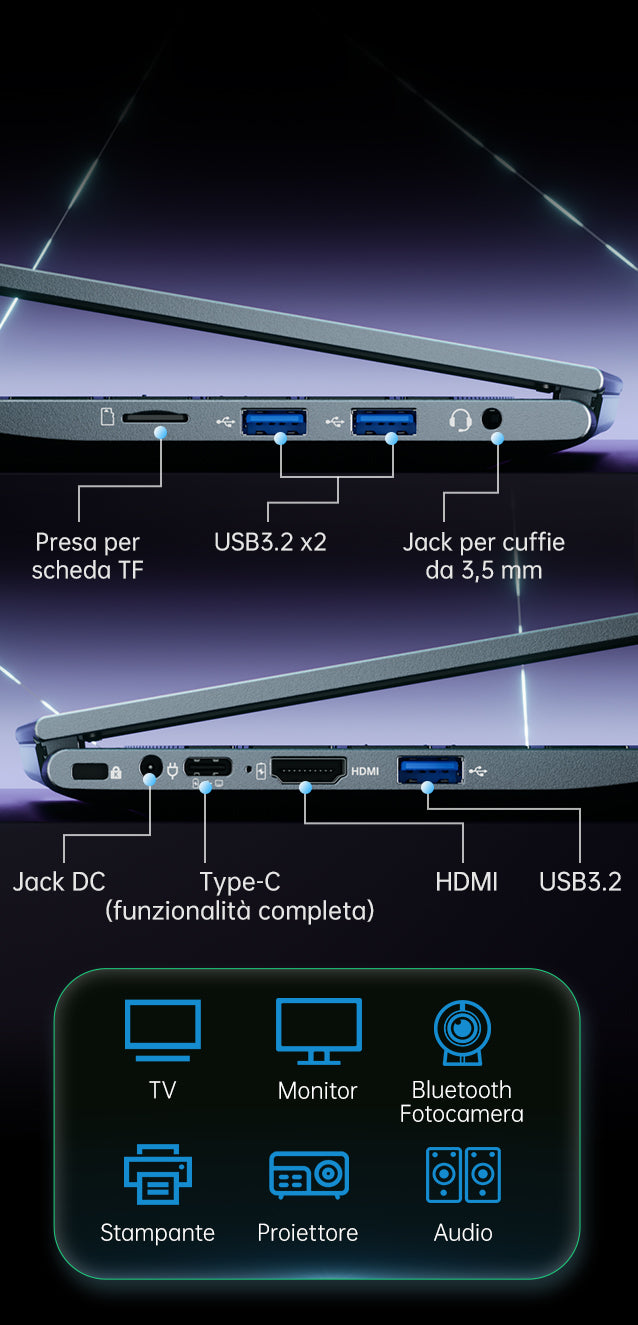 | Porte e Pulsanti | USB 3.2*3 Jack per Cuffie da 3,5 mm*1 DC IN*1 Connettore di Alimentazione Type-C*1 HDMI 1.4*1 Type-C*1 (Ricarica PD/DP1.4, Trasferimento Dati 8K@60Hz/20Gbps) Slot per Scheda TF*1 |