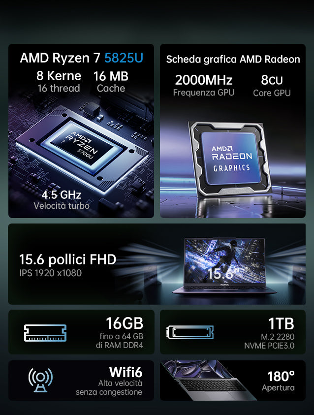 Il nuovo laptop ACEMAGIC LX15 Pro è dotato di un processore AMD Ryzen 7 7730U con una frequenza di clock compresa tra 2 GHz e 4,5 GHz. Il funzionamento quotidiano senza intoppi è garantito da 16 GB di RAM DDR4 e 512 GB di SSD, con possibilità di espandere la RAM a 64 GB e l'SSD a 4 TB. Il display IPS da 15,6 pollici con rapporto di formato 16:9 migliora la produttività e l'esperienza di navigazione.