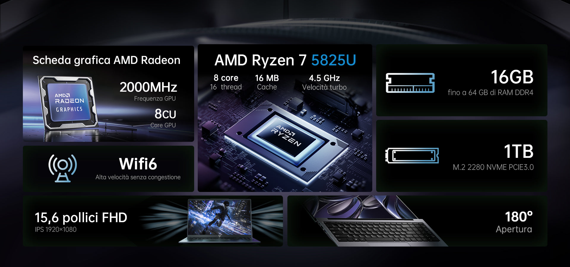 | Processore | AMD Ryzen™ 7 5825U Prozessor, 8 Core/16 Thread (16 MB L3-Cache, Frequenza Base 2,0 GHz, Frequenza Turbo Fino a 4,5 GHz) |