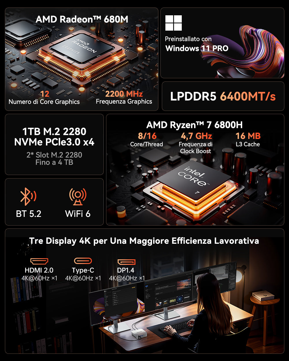 | Scheda Grafica | AMD Radeon™ 680M (Frequenza Grafica 2200 MHz, Numero di Core: 12) | |