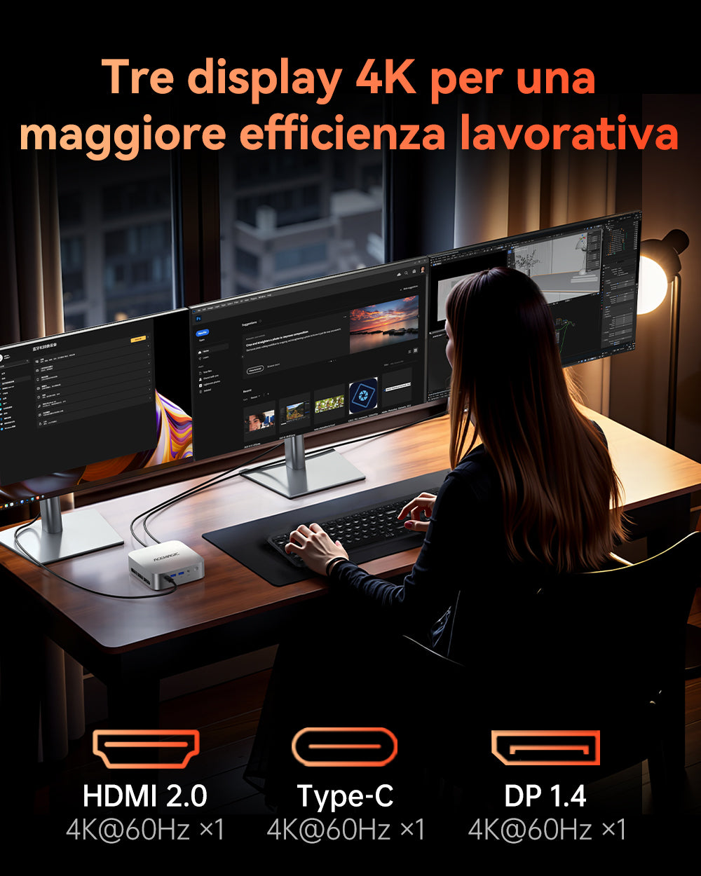 | Uscita Video | HDMI 2.0*1 (4K@60Hz) USB 3.2 Gen 2 Type-C ×1 con Funzionalità Complete, che Supporta Velocità di Trasferimento Fino a 10 Gbps / DP 1.4 (4K@60 Hz) DP 1.4*1 (4K@60Hz) |