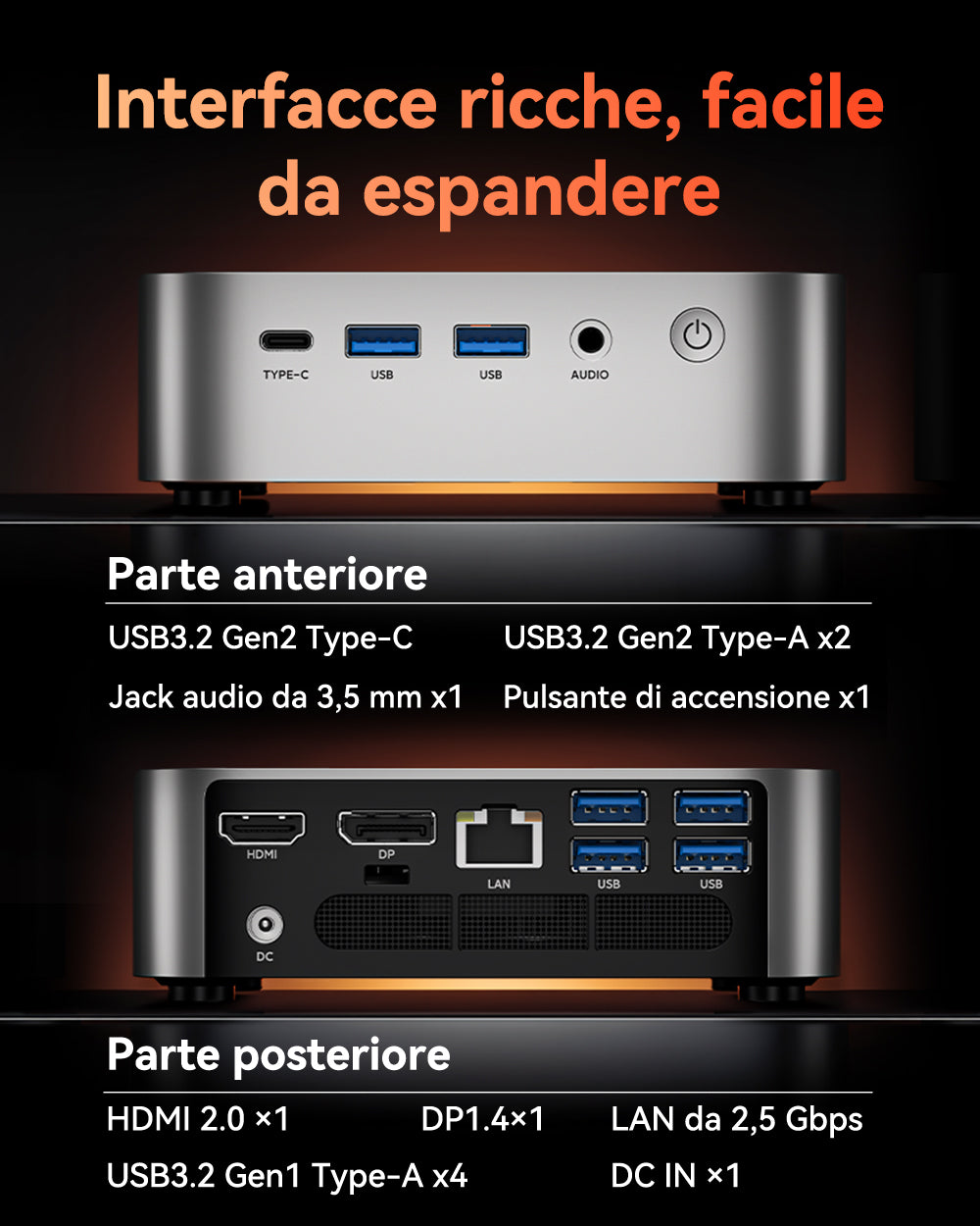 | Connessioni e Tasti | 10 M/100 M/1000 M/2,5 Gbps Adattivo RJ45 Gigabit Ethernet Porte USB 3.2 Gen 2 Type-A ×6 (10 Gbps sia anteriori che posteriori) USB 3.2 Gen2 Type-C*1 (Supporta DP 1.4, 4K@60Hz, Trasferimento Dati Massimo 10 Gbit/s, Uscita PD) Presa di Ingresso DC*1 HDMI 2.0*1 (4K@60Hz) DP 1.4*1 (4K@60Hz) Presa Audio da 3,5 mm*1 Pulsante di Accensione*1 |