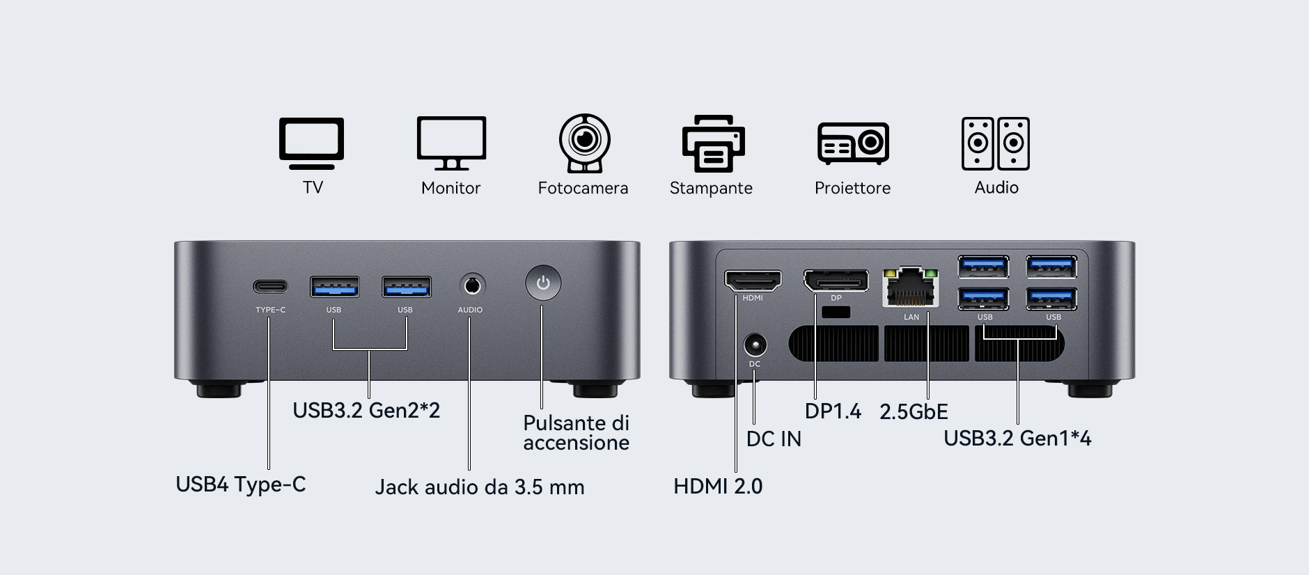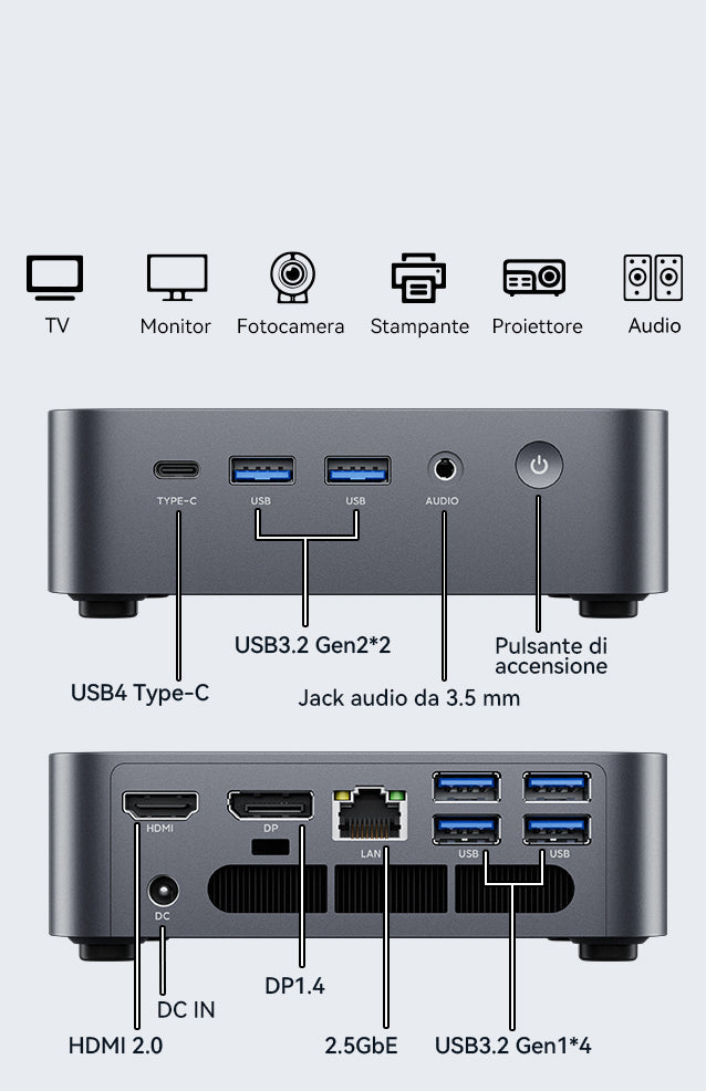 | Connessioni e pulsanti | RJ45 Gigabit Ethernet Adattivo da 10 M/100 M/1000 M/2,5 Gbps USB 3.2 Gen 2 Type-A*2 (Anteriore) USB 3.2 Gen 1 Type-A*4 USB 3.2 Gen2 Type-C*1 (Supporta DP 1.4, 4K@60Hz, Trasferimento Dati Massimo 10 Gbit/s, Uscita PD) Presa di Ingresso DC*1 HDMI 2.0*1 (4K@60Hz) DP 1.4*1 (4K@60Hz) Presa Audio da 3,5 mm*1 Pulsante di Accensione*1 |