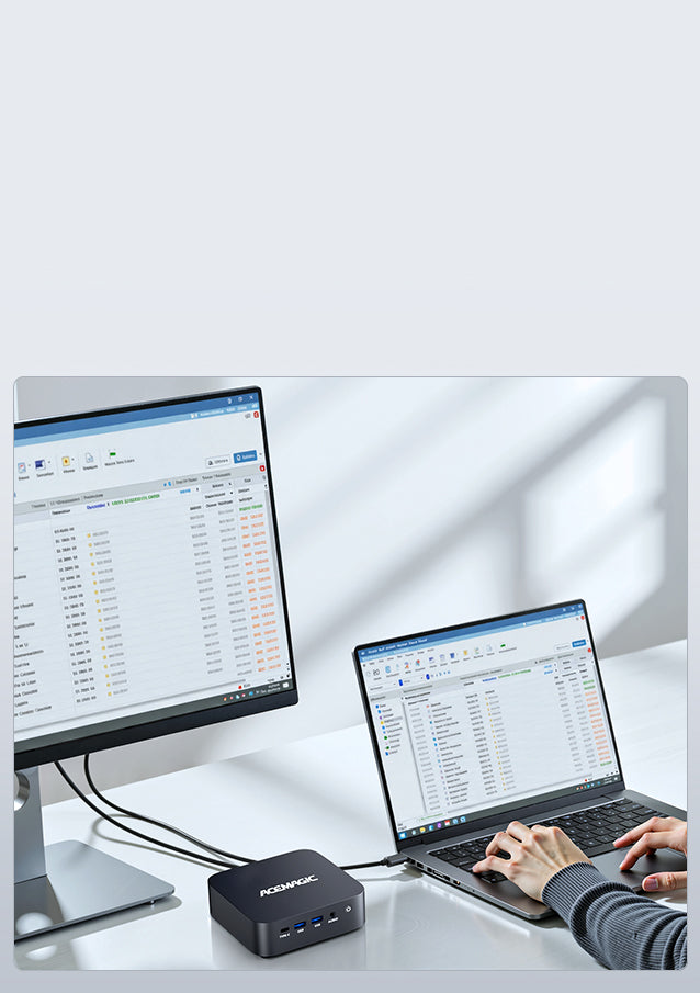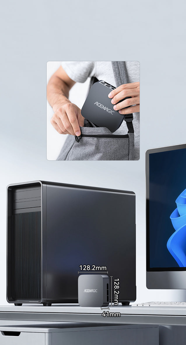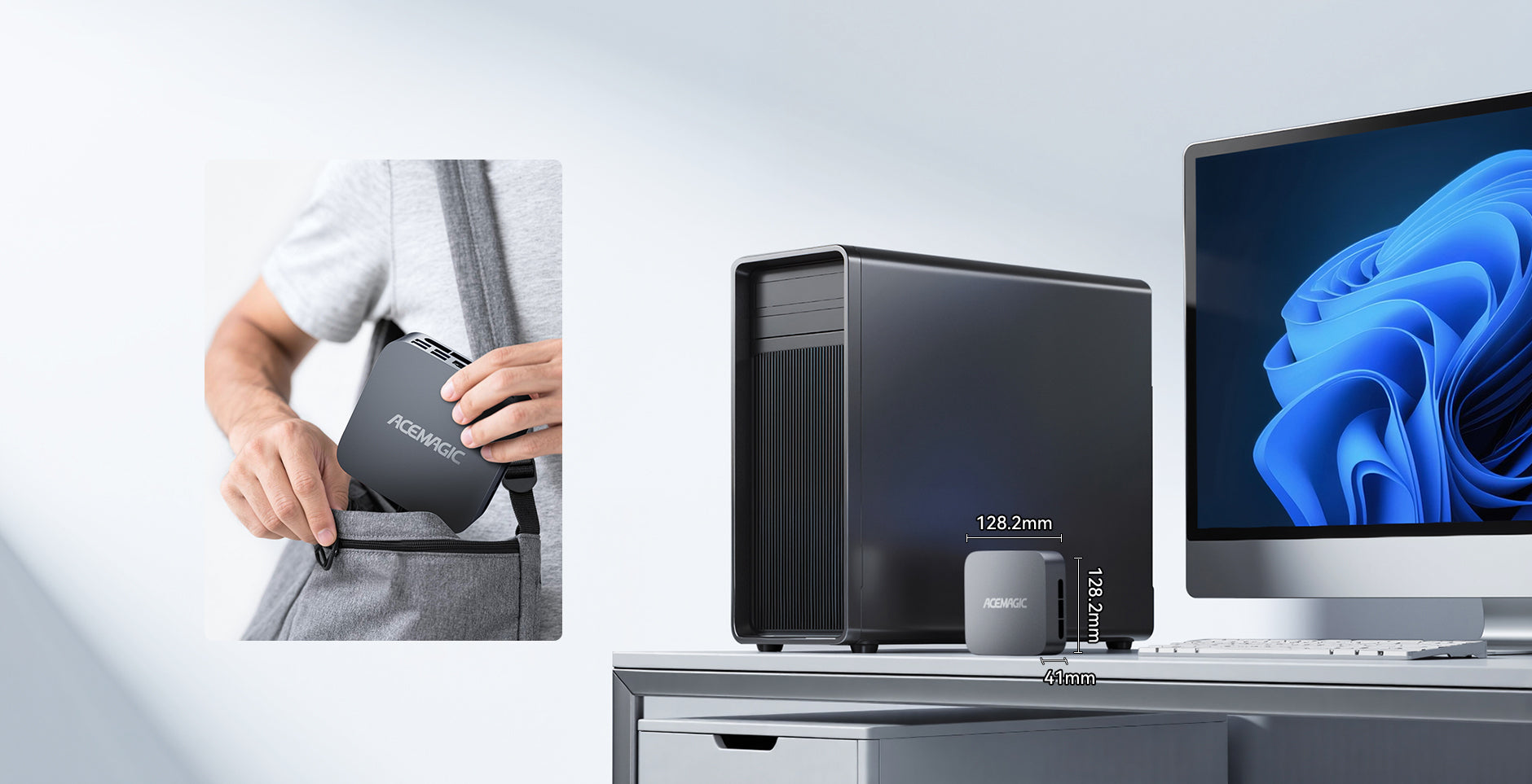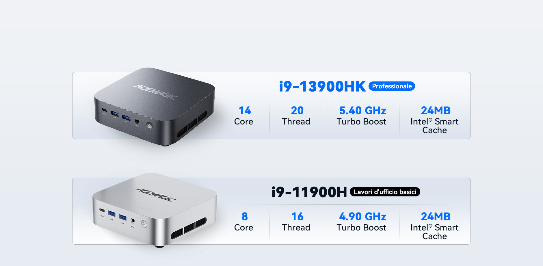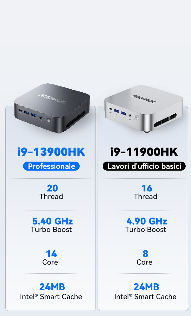 ACEMAGIC M1 è un potente mini PC dotato di processore Intel® Core™ i9-13900HK. Con 32 GB di RAM DDR4 e un SSD da 1 TB, è ideale per il lavoro. Supporta l'uscita su tre display 4K@60Hz, è compatibile con WiFi 6E e il suo sistema operativo è Windows 11 Pro.