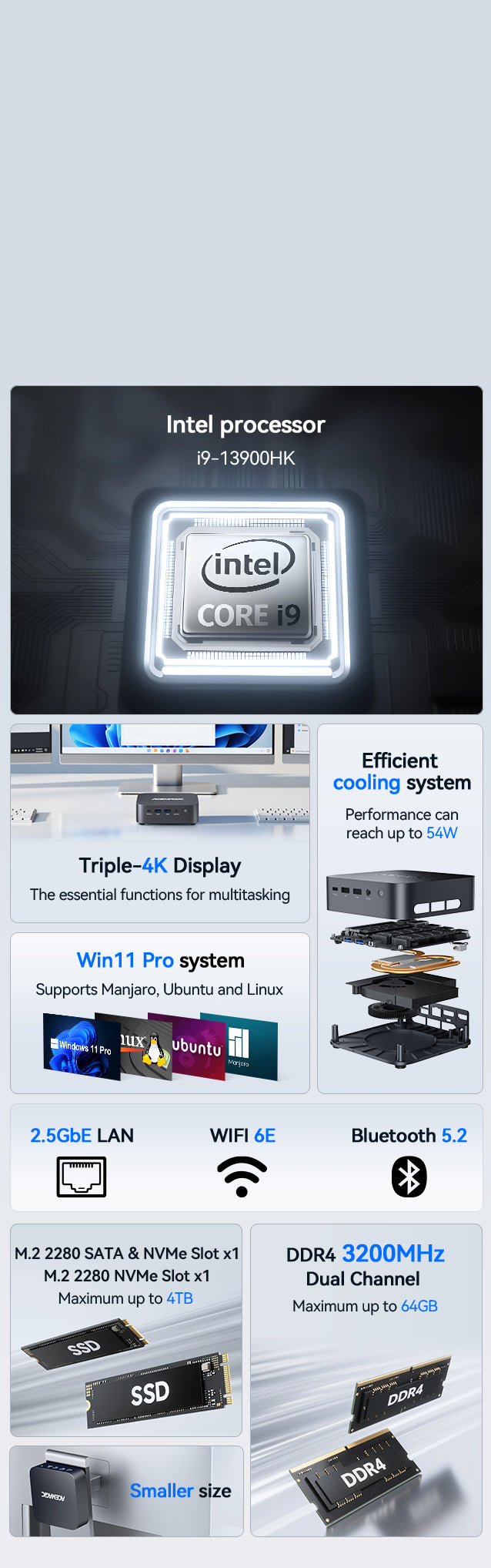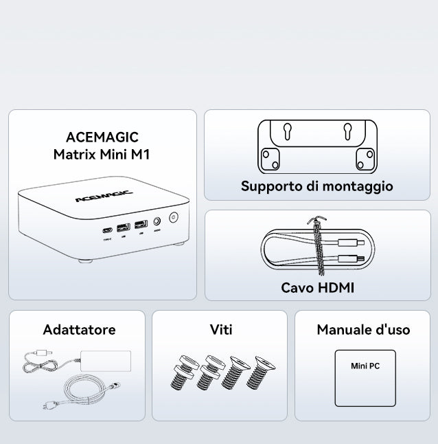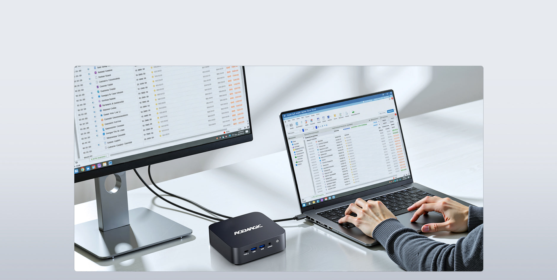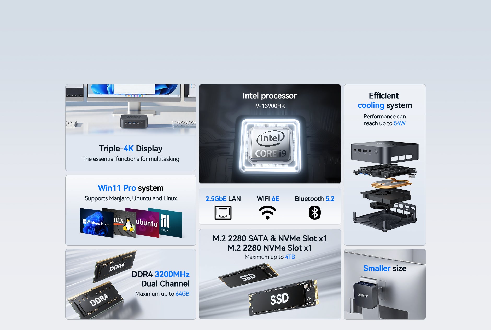 ACEMAGIC M1 è un potente mini PC dotato di processore Intel® Core™ i9-13900HK. Con 32 GB di RAM DDR4 e un SSD da 1 TB, è ideale per il lavoro. Supporta l'uscita su tre display 4K@60Hz, è compatibile con WiFi 6E e il suo sistema operativo è Windows 11 Pro.