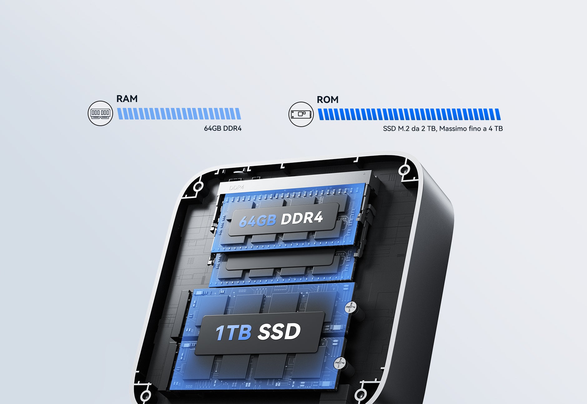 | RAM | DDR4 3200 MHz Dual Channel, Slot DDR4 SO-DIMM x2, Fino a 64 GB, Supportano Una Frequenza Massima di DDR4 3200 MHz |