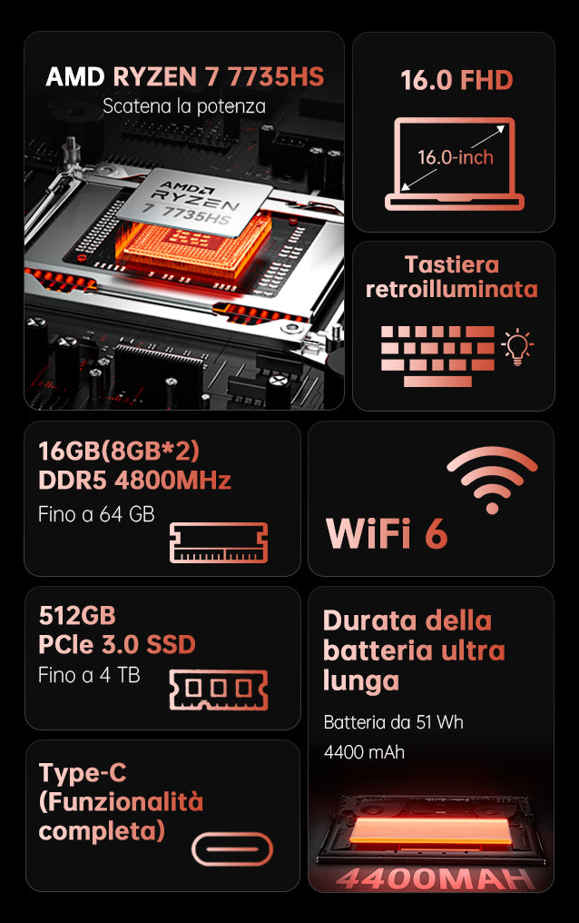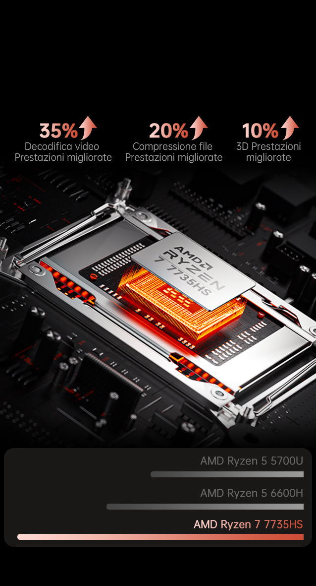 | Processore | Processore AMD Ryzen™ 7 7735HS, 8 Core/16 Thread, 3,2 GHz – 4,75 GHz |