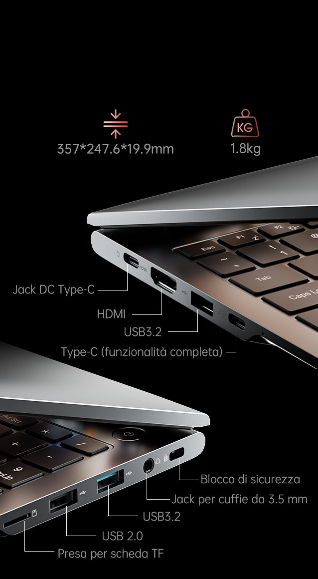 USB 2.0*1 Jack per Cuffie standard da 3,5 mm*1 HDMI 2.0*1 USB 3,2 Type-C*2 (Funzionalità completa) *2 ( Type-C IN ) Slot per Scheda TF*1 Buco della Serratura*1 |