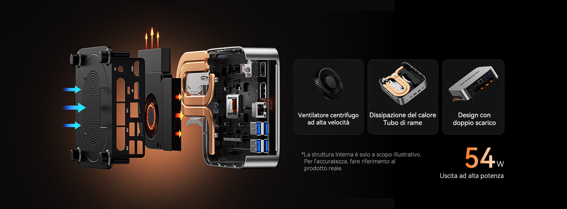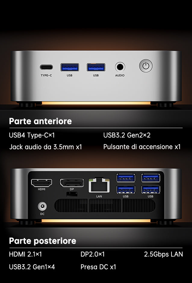 | Connessioni e pulsanti | 10 M/100 M/1000 M/2,5 Gbps Adattivo RJ45 Gigabit Ethernet USB 3.2 Gen 2 Type-A*2 (anteriore) USB 3.2 Gen 1 Type-A*4 USB 4 Type-C*1 (Supporta DP 1.4, 8K@60Hz, Trasferimento Dati Massimo 40 Gbit/s, Uscita PD) Presa di Ingresso DC*1 HDMI 2.0*1 (4K@60Hz) DP 2.0*1 (8K@60Hz) Presa Audio da 3,5 mm*1 Pulsante di Accensione*1 |