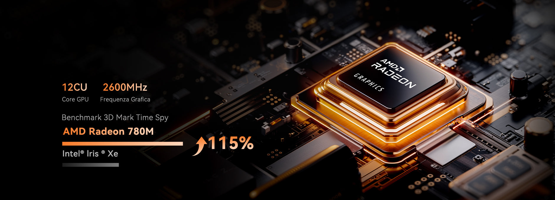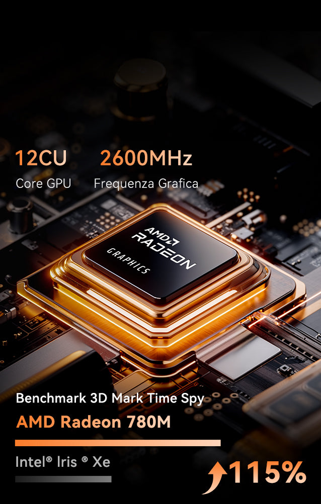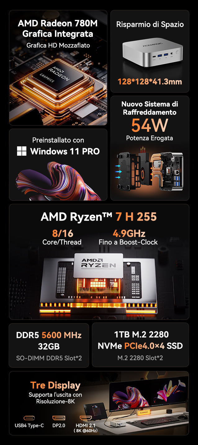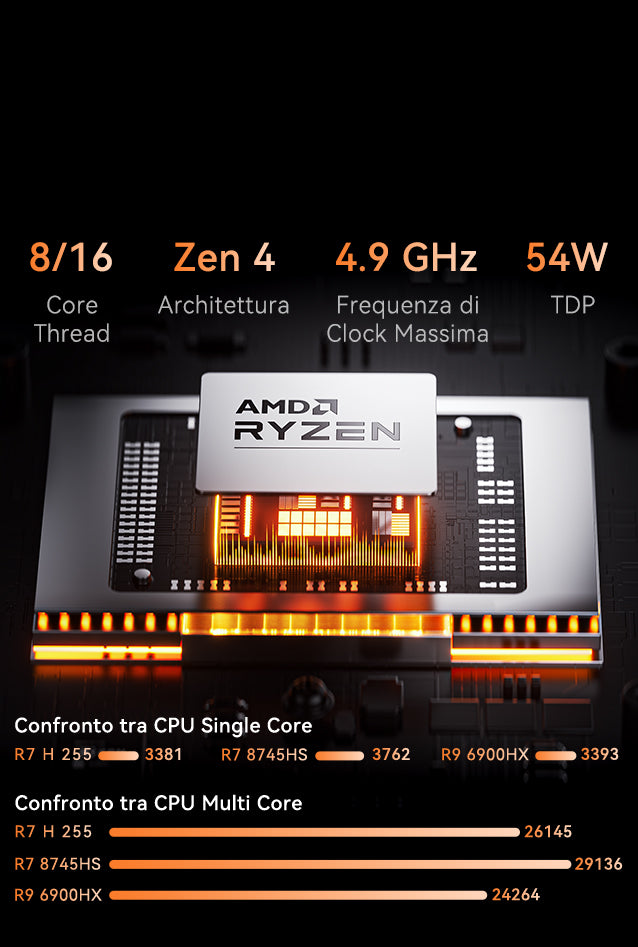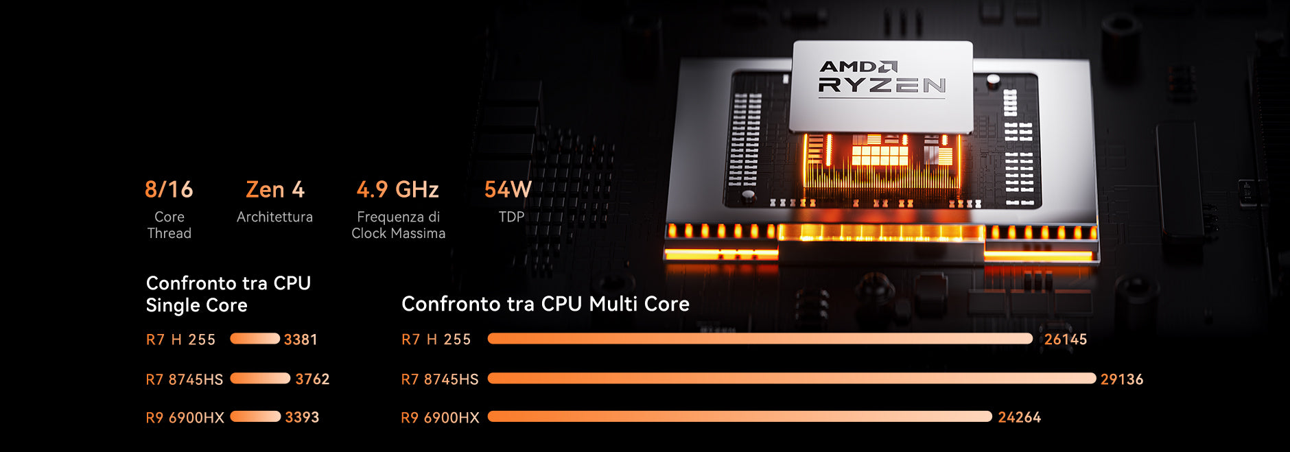 | Processore | AMD Ryzen™ 7 H255, 8 Core/16 Thread (Architettura Zen4, Processo TSMC 4nm FinFET, 16 MB di Cache L3, Frequenza Base 3,8 GHz, Frequenza Turbo Fino a 4,9 GHz) |