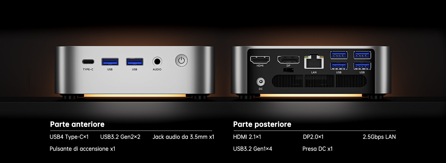 | Connessioni e pulsanti | 10 M/100 M/1000 M/2,5 Gbps Adattivo RJ45 Gigabit Ethernet USB 3.2 Gen 2 Type-A*2 (anteriore) USB 3.2 Gen 1 Type-A*4 USB 4 Type-C*1 (Supporta DP 1.4, 8K@60Hz, Trasferimento Dati Massimo 40 Gbit/s, Supporta l'Alimentazione PD100W, Uscita PD) Presa di Ingresso DC*1 HDMI 2.1*1 (8K@60Hz) DP 2.0*1 (8K@60Hz O 4K@120Hz) Presa Audio da 3,5 mm*1 Pulsante di Accensione*1 |