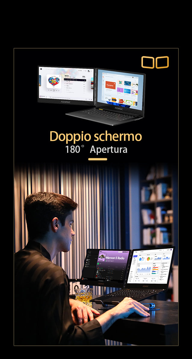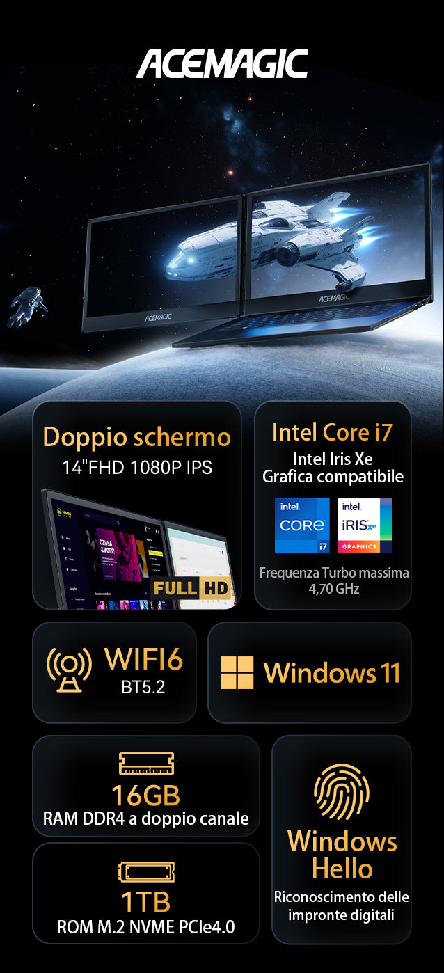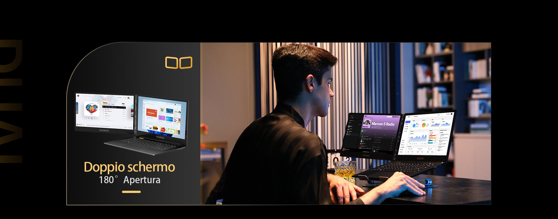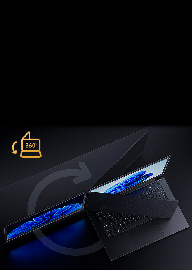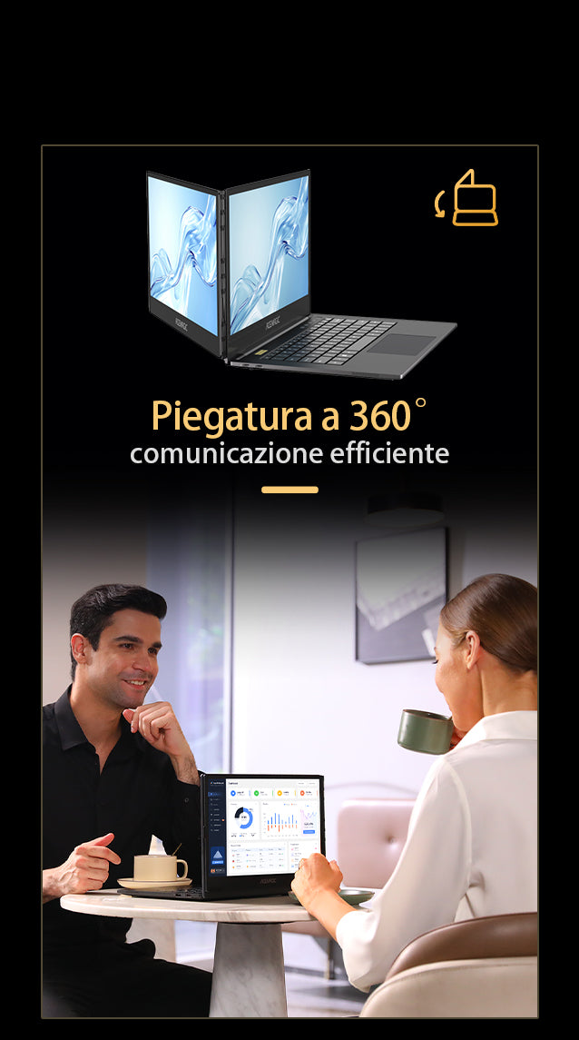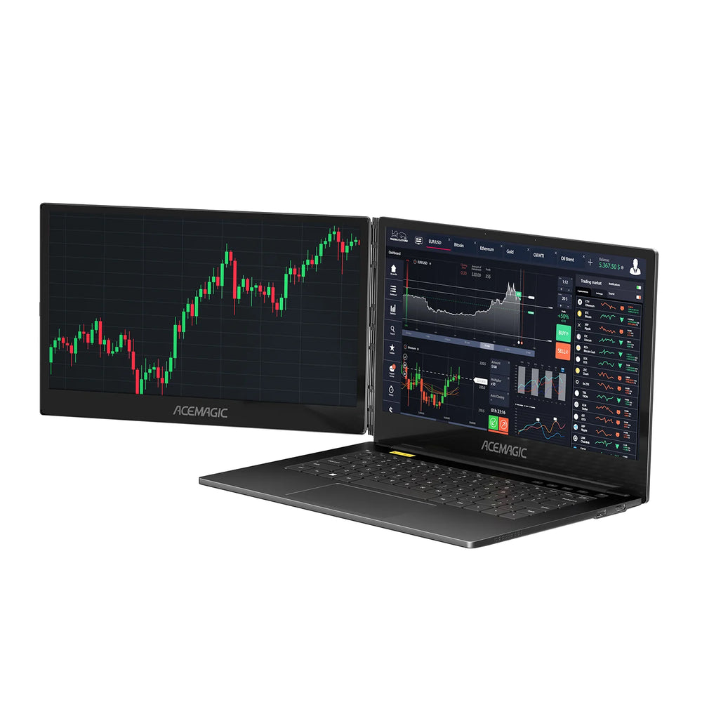 L'ACEMAGIC X1 è un laptop business all'avanguardia con doppio schermo a 360°, dotato di processore Intel Core™ i7-1255U. I suoi due display Full HD da 14 pollici offrono flessibilità grazie a un esclusivo design a doppio schermo che può essere ruotato orizzontalmente di 360°. Ciò aumenta la produttività e consente una comunicazione aziendale personale efficiente, mantenendo la privacy sul desktop e trasmettendo un'immagine professionale.