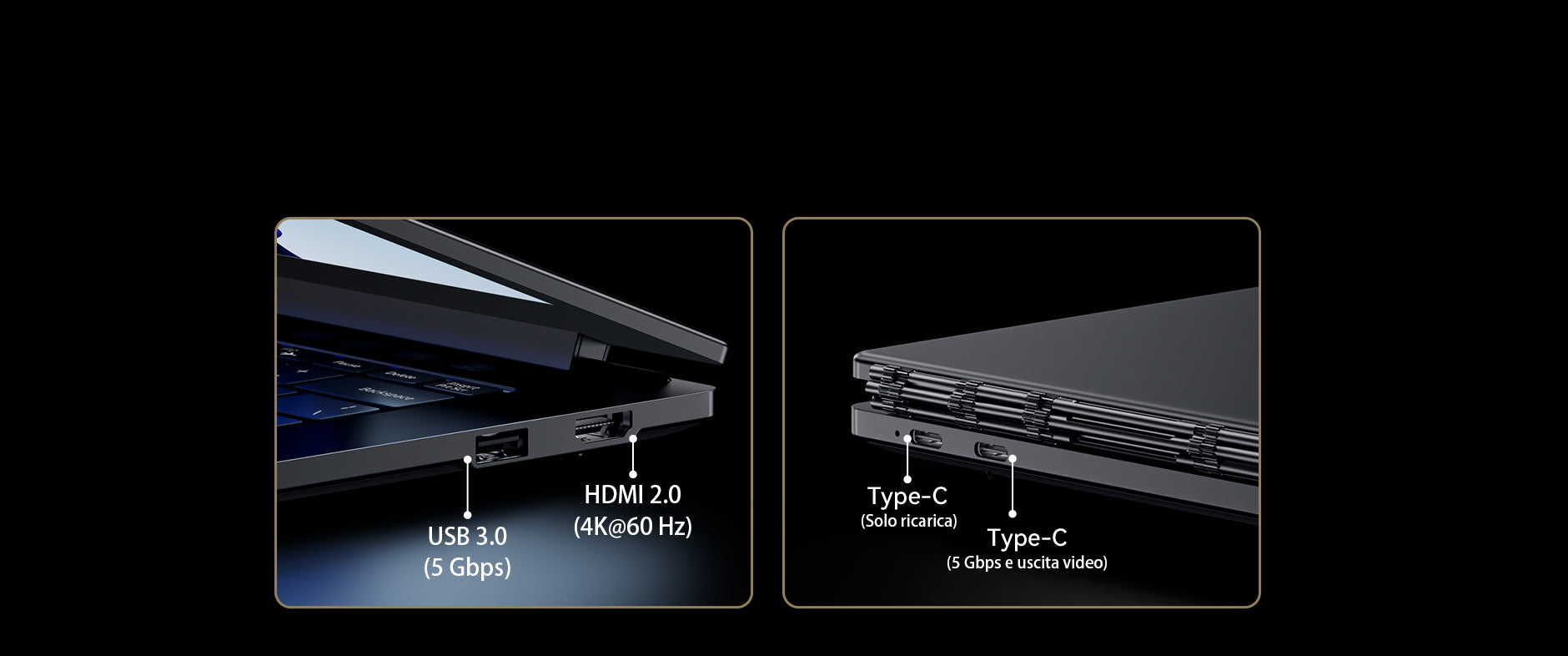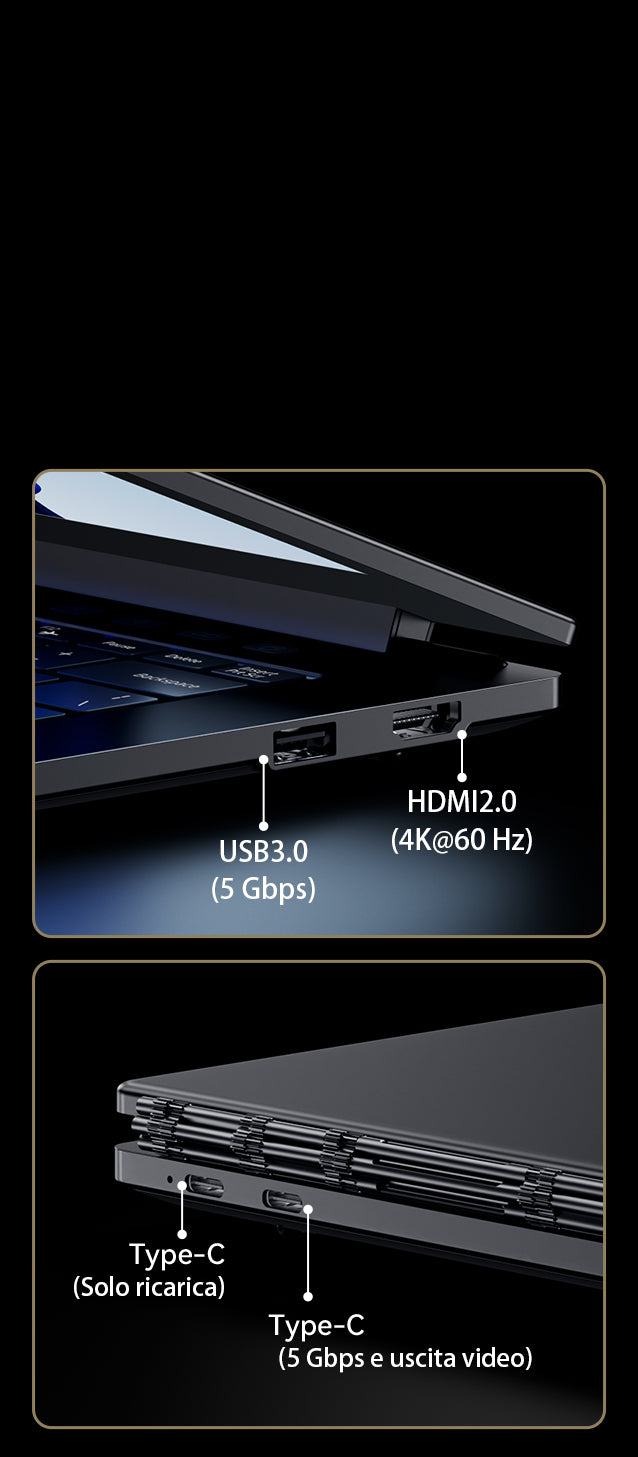 | Connessioni e tasti | USB 3.0 Gen 1, USB 2.0 DMIC*2 Connessione di Alimentazione Type-C HDMI 2.0 (4K@60 Hz) USB 3.2 Type-C, Gen 2 (Ricarica PD/DP1.4, Trasferimento Dati 8K@60Hz/20Gbps) |